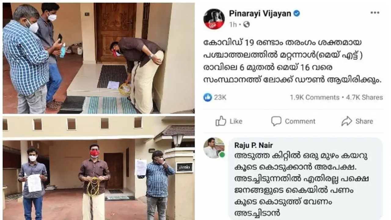 കൊച്ചി: ലോക് ഡൗണിൽ വിതരണം ചെയ്യുന്ന കിറ്റിനൊപ്പം ഒരു മുഴം കയർ കൂടി വെക്കണമെന്ന് മുഖ്യമന്ത്രി പിണറായി വിജയന്റെ എഫ് ബി പോസ്റ്റിൽ കമന്റിട്ട കോൺഗ്രസ് നേതാവിന്റെ വീടിന്റെ വരാന്തയിൽ കയർ വെച്ച് ഡിവൈഎഫ്ഐ പ്രവർത്തകർ. എറണാകുളം മുളന്തുരുത്തി ബ്ലോക്ക് പഞ്ചായത്ത് പ്രസഡിന്റ് രാജു പി നായരുടെ വീട്ടിലാണ് പ്രതിഷേധ സൂചകമായി ഡിവൈഎഫ്ഐ പ്രവർത്തകർ ഒരു മുഴ കയർ വെച്ചത്. ഡിവൈഎഫ്ഐ ഉദയംപേരൂർ നോർത്ത് മേഖല കമ്മിറ്റിയുടെ നേതൃത്വത്തിലായിരുന്നു പ്രതിഷേധം. കൊവിഡ് ലോക് ഡൗണിൽ അടച്ചിടുന്നതിന് എതിരല്ല. പക്ഷെ ഒരു മുഴം കയർകൂടെ കൊടുത്ത് വേണം അടച്ചിടാൻ എന്നായിരുന്നു കമന്റ്.