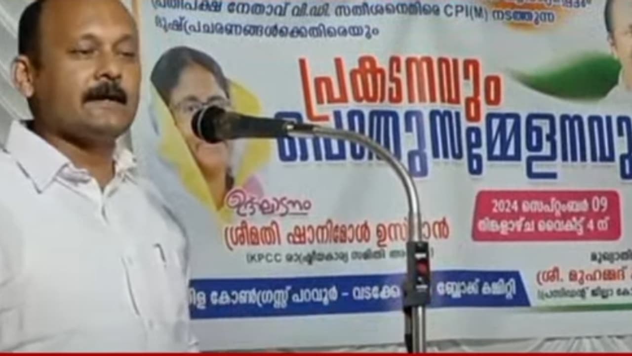 മഹിളാ കോൺഗ്രസ് പറവൂരിൽ സംഘടിപ്പിച്ച പൊതു സമ്മേളനത്തിലായിരുന്നു മുഖ്യമന്ത്രിക്കെതിരായ കോൺഗ്രസ് നേതാവിന്റെ അധിക്ഷേപം. പ്രസംഗത്തിനിടെ മുഖ്യമന്ത്രിയെ പൂരം കലക്കി വിജയനെന്നും വിളിച്ചു