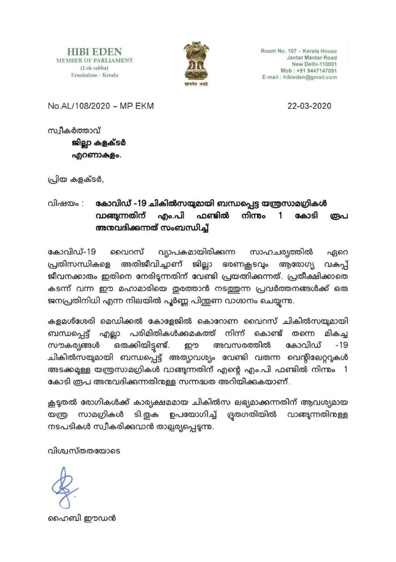 ഇക്കാര്യം അറിയിച്ച് എറണാകുളം ജില്ലാ കളക്ടർക്ക് ഹൈബി ഈഡൻ എംപി കത്ത് നൽകി. കൊവിഡ് രോഗം വ്യാപകമാകുന്ന സാഹചര്യത്തിൽ ഏറെ പ്രതിസന്ധികളെ അതിജീവിച്ചാണ് ജില്ലാ ഭരണകൂടവും ആരോഗ്യവകുപ്പും അതിനെ നേരിടുന്നത്. ഈ സാഹചര്യത്തിൽ കൊവിഡിനെ നേരിടാനുള്ള പ്രവർത്തനങ്ങൾക്ക് തന്റെ എല്ലാ പിന്തുണയും വാഗ്ദാനം ചെയ്യുന്നതായും ഹൈബി അറിയിച്ചു.