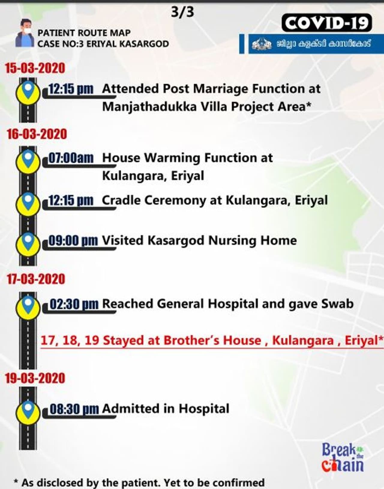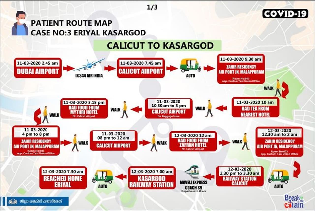 കരിപ്പൂർ വിമാനത്താവളത്തിറങ്ങിയ മാർച്ച് 11 മുതൽ ആശുപത്രിയിൽ പ്രവേശിക്കപ്പെട്ട മാർച്ച് 19 വരെയുള്ള ദിവസങ്ങളിലെ റൂട്ട് മാപ്പാണ് പുറത്ത് വിട്ടിരിക്കുന്നത്.