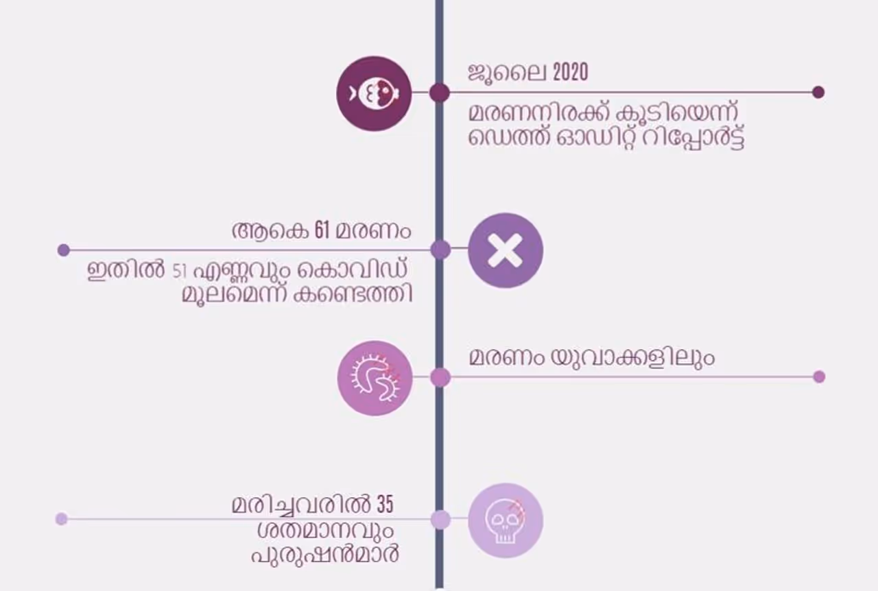 മരിച്ച ആളുകളിലെ ഏറ്റവും കുറഞ്ഞ പ്രായം 28 ആയിരുന്നു. ചെറുപ്പക്കാരിലെ മരണനിരക്ക് ആശങ്ക തന്നെയാണ്. മരിച്ചവരിൽ 35 ശതമാനം പുരുഷന്മാരാണ്. 16 ശതമാനം സ്ത്രീകളും. ജൂലൈ മാസത്തില് ഏറ്റലും കൂടുതല് മരണം സംഭവിച്ചത് എറണാകുളം ജില്ലയിലാണ്. 13. തൊട്ടുപിന്നില് തിരുവനന്തപുരം. 8 പേര്. മൂന്നാം സ്ഥാനം കാസര്കോഡിനും കോഴിക്കോടിനുമാണ്. കൊവിഡ് മരണങ്ങളെന്നു പറയുന്പോഴും കൊവിഡ് ബാധ മാത്രം ഉണ്ടായിരുന്നവര് 6 ശതമാനം മാത്രമാണ്. മരിച്ചവരില് 65 ശതമാനം പേര്ക്ക് ഉയര്ന്ന രക്തസമ്മര്ദവും 69ശതമാനം പേര്ക്ക് പ്രമേഹവും ഉണ്ടെന്ന് കണ്ടെത്തി. മരിച്ചവരില് 12 ശതമാനം പേര്ക്ക് അര്ബുദ ബാധ ഉണ്ടായിരുന്നുവെന്നും ഡെത്ത് ഓഡിറ്റ് റിപ്പോര്ട്ട് പറയുന്നു.