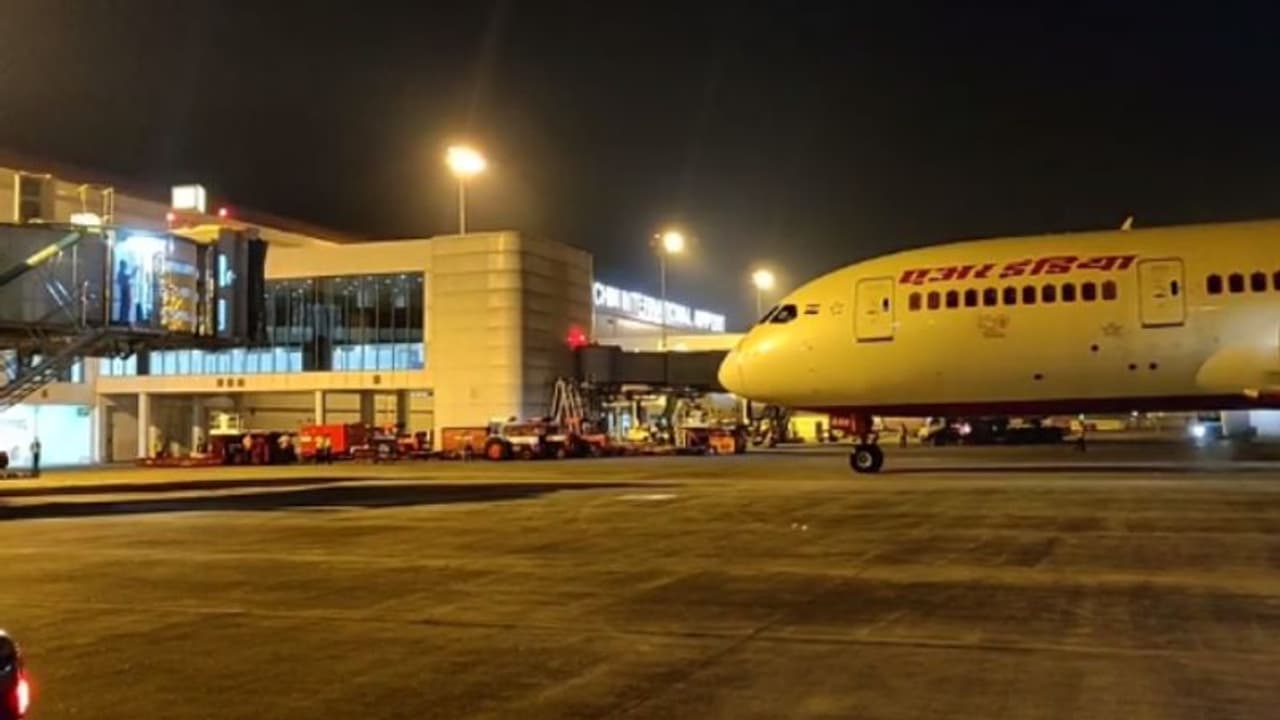 എ ഐ 1186 വിമാനം. 130 യാത്രക്കാർ.ലണ്ടനിൽ നിന്ന് ഒൻപതര മണിക്കൂർ പറന്ന് എത്തിയ എയർ ഇന്ത്യ വിമാനത്തിന് ജലാഭിവാദ്യം നൽകിയാണ് കൊച്ചി വിമാനത്താവളം വരവേറ്റത്.