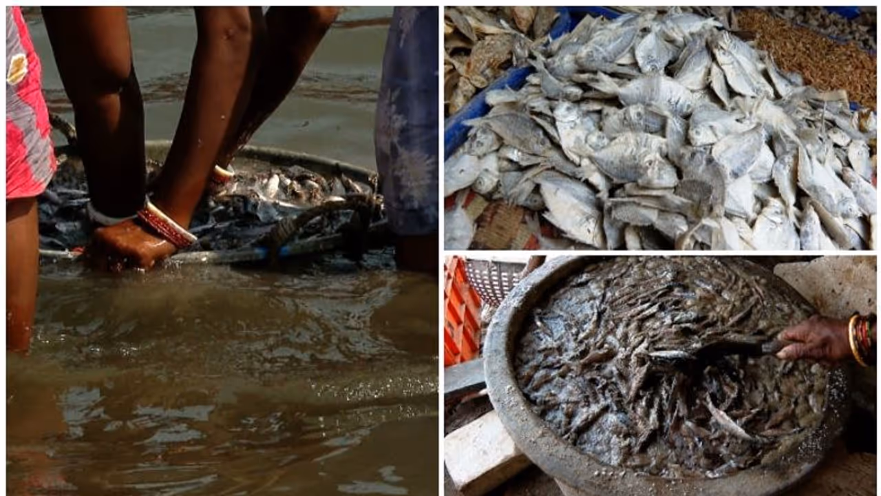 പുലർച്ചെ മുതൽ സജീവമായ തുറമുഖത്ത് പത്തിനൊന്ന് മണിയോടെ ഗുണമേൻമയുള്ള പച്ച മത്സ്യങ്ങളത്രയും കച്ചവടം ചെയ്ത് തീരും. ബാക്കിയാകുന്ന, അഴുകിത്തുടങ്ങിയ മത്സ്യം ചുളുവിലയ്ക്ക് എടുത്താണ് ഉണക്കമീനാക്കാൻ അടുത്തുള്ള മുക്കുവ ദ്വീപിലേക്ക് കൊണ്ടുപോകുന്നത്. ചെറു ചെറു യൂണിറ്റുകളായി ബിഹാറിൽ നിന്നും ഉത്തർപ്രദേശിൽ നന്നുമൊക്കെ എത്തിയ സ്ത്രീകളാണ് ഉണക്കമീൻ തയ്യാറാക്കുന്നത്. അഴുക്ക് നിറഞ്ഞ നിലത്ത് കൂട്ടിയിട്ടാണ് ഇവര് മീൻ മുറിക്കുന്നത്. മീൻ കഴുകാനായി കൊണ്ടുപോകുന്ന ഇടം കണ്ടല് എല്ലാവരും ഞെട്ടും. മനുഷ്യ വിസർജ്യം കലർന്ന, മാലിന്യങ്ങൾ അടിഞ്ഞുകൂടി കറുത്ത നിറമായ വെള്ളത്തിൽ രണ്ട് തവണ മുക്കിയെടുക്കുകയാണ് ഇവിടെ ചെയ്യുന്നത്.