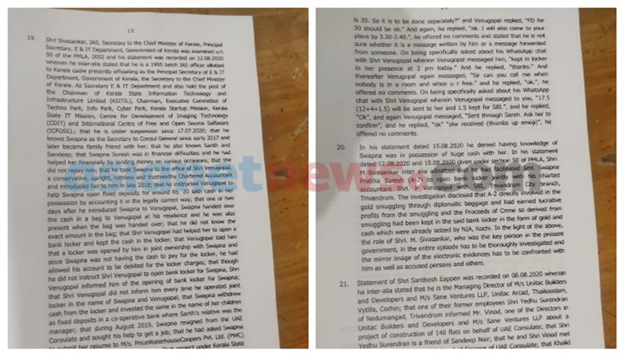 മുഖ്യമന്ത്രിയുടെ മുൻ പ്രിൻസിപ്പൽ സെക്രട്ടറിയായിരുന്ന എം ശിവശങ്കറിനെക്കുറിച്ച് കൂടുതൽ അന്വേഷണം വേണമെന്നാണ് എൻഫോഴ്സ്മെന്റ് ഡയറക്ടേറ്റ് കുറ്റപത്രത്തിൽ പറയുന്നത്. സ്വപ്നയുടെ ബാങ്ക് ലോക്കർ സംബന്ധിച്ചുള്ള സന്ദേശങ്ങളിൽ ദുരൂഹതയുണ്ട്.