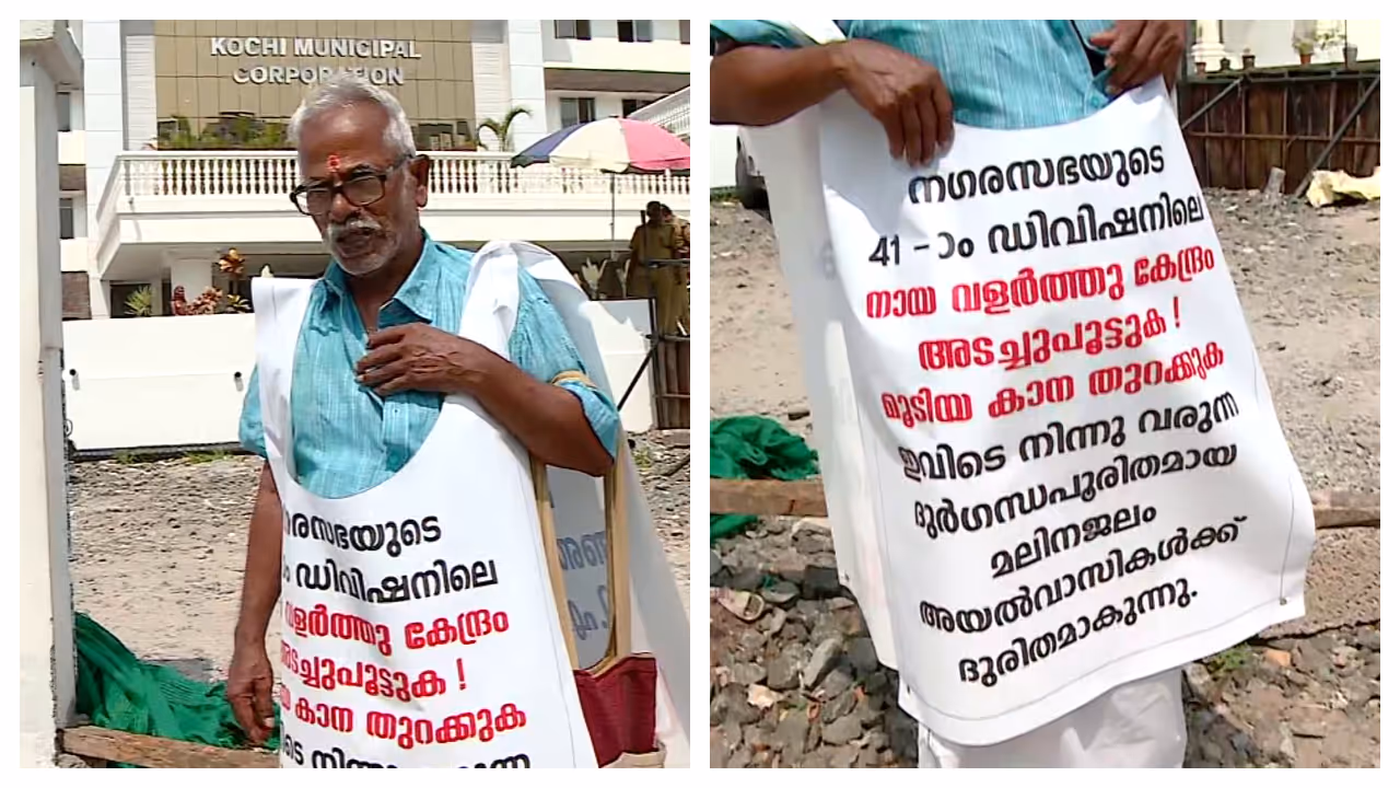 എറണാകുളം: കൊടും വെയിലത്ത് കൊച്ചി കോർപ്പറേഷന് മുന്നിൽ നിൽപ്പ് സമരം നടത്തി വയോധികൻ. വൈറ്റില സ്വദേശി പ്രതാപൻ എന്ന 74കാരനാണ് കോർപ്പറേഷൻ കവാടത്തിന് മുന്നിൽനിന്ന് പ്രതിഷേധിക്കുന്നത്. അയൽവാസി പൊതുതോട് അടച്ചതിനെ തുടർന്ന് നായയുടെ വിസർജ്യം അടങ്ങിയ മലിനജലം സ്വന്തം വീട്ടിലേക്ക് ഒഴുകി എത്തുന്നു. എന്നാൽ ഇക്കാര്യത്തിൽ പരാതി നൽകിയിട്ടും പരിഹരിക്കാൻ കോർപ്പറേഷൻ തയ്യാറാകുന്നില്ലെന്നാണ് പ്രതാപന്റെ ആരോപണം. നായ വളർത്തു കേന്ദ്രം അടച്ചുപൂട്ടണമെന്നും, മൂടിയ കാന തുറക്കണമെന്നുമാണ് പ്രതാപന്റെ ആവശ്യം. ഇതേത്തുടർന്നാണ് ഇപ്പോൾ നിൽപ്പ് സമരം നടത്തുന്നത്.