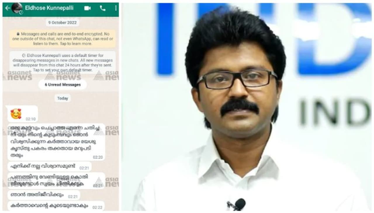 പണത്തിന്റെ കൊതി തീരുമ്പോൾ സ്വയം ചിന്തിക്കണമെന്ന് എൽദോസ് സന്ദേശത്തിൽ പറയുന്നു.