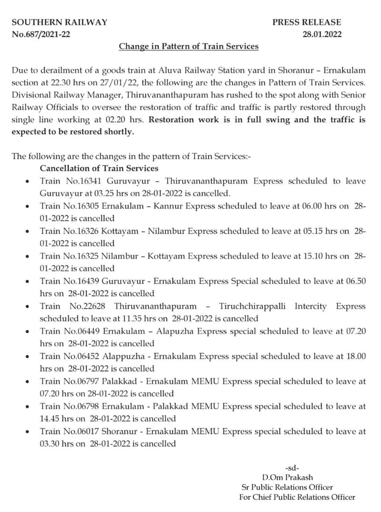 പാളം തെറ്റിയ നാലിൽ മൂന്ന് ബോഗികൾ പാളത്തിൽ നിന്ന് നീക്കിയതോടെ ഭാഗികമായി റെയിൽ ഗതാഗതം പുനസ്ഥാപിച്ചിട്ടുണ്ട്.