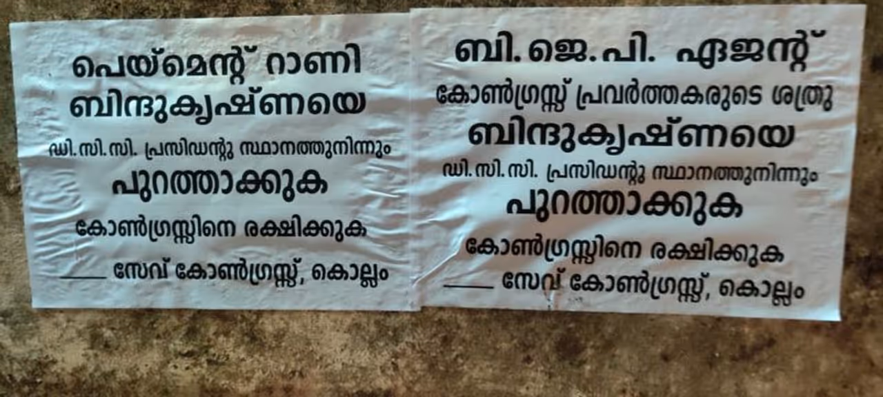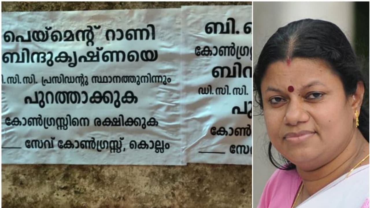 ബിന്ദുകൃഷ്ണ ബിജെപിയുടെ ഏജന്റാണ്, പേയ്മെന്റ് റാണിയായ ബിന്ദുകൃഷ്ണ കോണ്ഗ്രസിന്റെ ശത്രുവാണെന്നും പാര്ട്ടിയില് നിന്ന് പുറത്താക്കണമെന്നും പോസ്റ്ററില് ആവശ്യപ്പെടുന്നു. കൊല്ലം ഡിസിസി ഓഫീസിനും ആർ.എസ്.പി ഓഫീസിനും മുന്നിലാണ് പോസ്റ്റർ പ്രത്യക്ഷപ്പെട്ടിരിക്കുന്നത്.