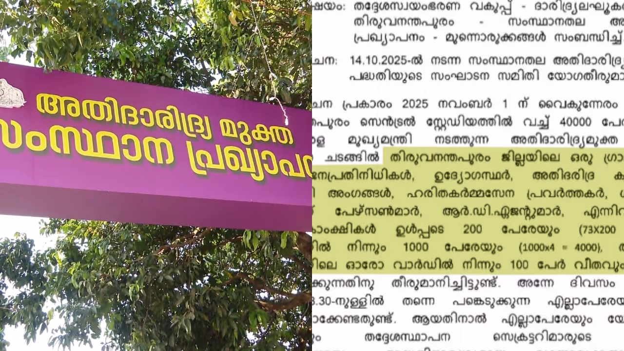 അതിദാരിദ്ര മുക്ത പ്രഖ്യാപന സമ്മേളനത്തിൽ ആളെക്കൂട്ടാൻ ക്വാട്ട നിശ്ചയിച്ച് സര്ക്കാര്. ഒരോ തദ്ദേശ സ്ഥാപനങ്ങളിൽ നിന്നും ആളുകളെ പങ്കെടുപ്പിക്കുന്നത് സംബന്ധിച്ചുള്ള ക്വാട്ട നിശ്ചയിച്ചുകൊണ്ട് സര്ക്കാര് കത്തയച്ചു.