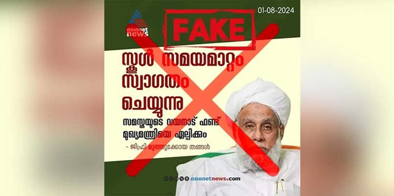 മുണ്ടക്കൈ: വയനാട്ടിലെ മുണ്ടക്കൈലുണ്ടായ വലിയ ഉരുള്പൊട്ടലില് രക്ഷാപ്രവര്ത്തനം തുടരുന്നതിനിടെ ഏഷ്യാനെറ്റ് ന്യൂസിന്റെയും സമസ്ത നേതാവ് ജിഫ്രി മുത്തുക്കോയ തങ്ങളുടെയും പേരില് സാമൂഹ്യമാധ്യമങ്ങളില് വ്യാജ പ്രചാരണം. 'സ്കൂള് സമയമാറ്റം സ്വാഗതം ചെയ്യുന്നു, സമസ്തയുടെ വയനാട് ഫണ്ട് മുഖ്യമന്ത്രിയെ ഏല്പിക്കും'- എന്നും ജിഫ്രി മുത്തുക്കോയ തങ്ങള് പറഞ്ഞതായി ഏഷ്യാനെറ്റ് ന്യൂസ് വാര്ത്താ കാര്ഡ് ഓഗസ്റ്റ് ഒന്നിന് പുറത്തിറക്കിയതായാണ് സോഷ്യല് മീഡിയയിലെ വ്യാജ പ്രചാരണം.
