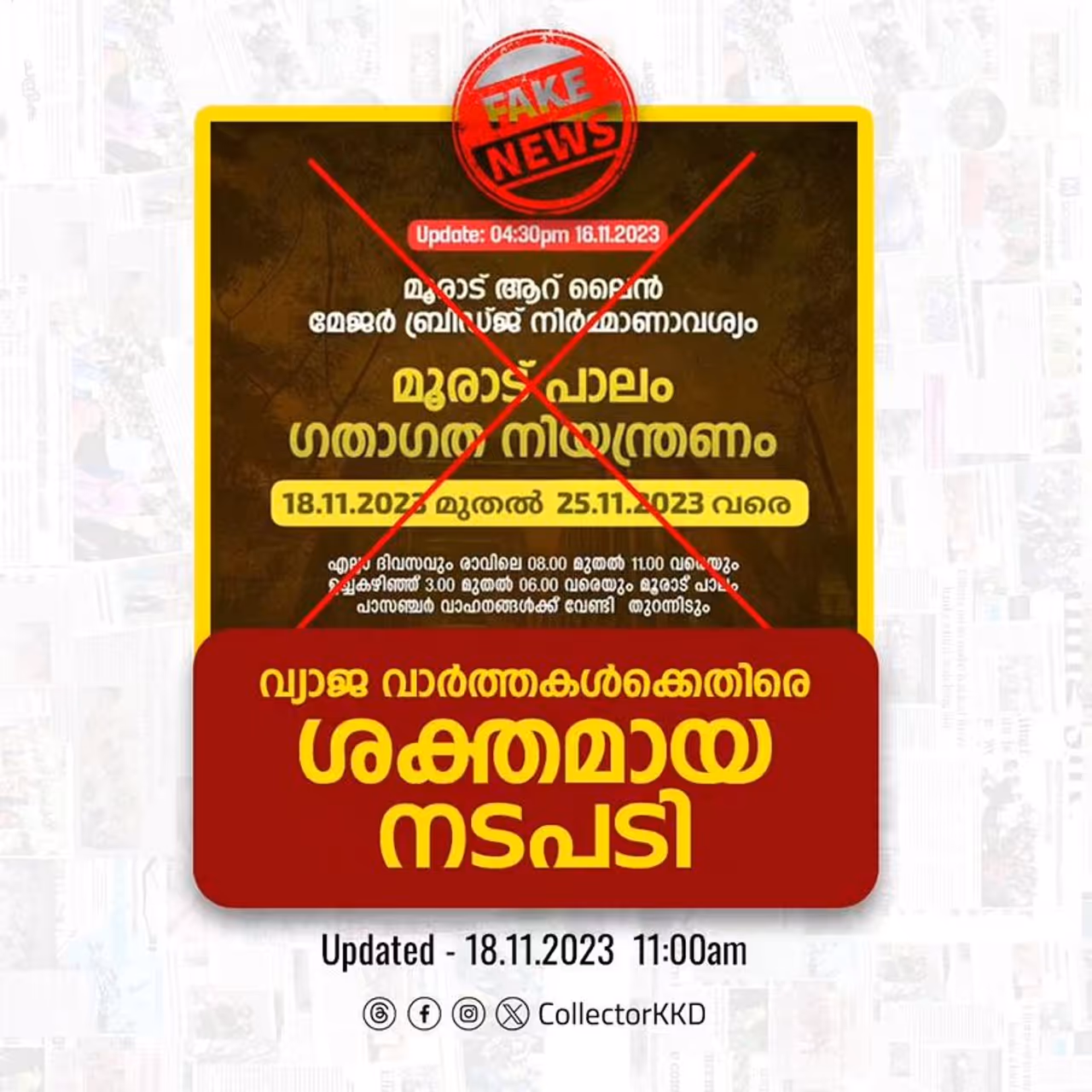 കോഴിക്കോട് കലക്ടര് 2023 നവംബര് 16-ാം തിയതി പുറത്തിറക്കിയ അറിയിപ്പ് എന്ന പേരിലാണ് കാര്ഡ് സാമൂഹ്യമാധ്യമങ്ങളില് പ്രത്യക്ഷപ്പെട്ടത്. ഇത് പല വാട്സ്ആപ്പ് ഗ്രൂപ്പുകളിലും വ്യാപകമായി ഷെയര് ചെയ്യപ്പെട്ടു. മൂരാട് ആറ് ലൈന് മേജര് ബ്രിഡ്ജ് നിര്മാണാവശ്യത്തിനായി 18-11-2023 മുതല് 25-11-2023 വരെ പാലത്തില് ഗതാഗത നിയന്ത്രണം ഏര്പ്പെടുത്തുന്നു എന്നായിരുന്നു കോഴിക്കോട് കലക്ടറുടെ പേരിലുള്ള മുന്നറിയിപ്പ് സന്ദേശത്തിലുണ്ടായിരുന്നത്. എല്ലാ ദിവസവും രാവിലെ 08.00 മുതല് 11.00 വരെയും ഉച്ചകഴിഞ്ഞ് 03.00 മുതല് 06.00 വരെയും മൂരാട് പാലം പാസഞ്ചര് വാഹനങ്ങള്ക്ക് വേണ്ടി തുറന്നിടും എന്നും കാര്ഡിലുണ്ടായിരുന്നു. ഈ കാര്ഡിന്റെ ചുവടെയായി കോഴിക്കോട് കലക്ടര് എന്ന എഴുത്തും കാണാം.