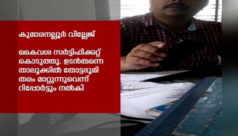 കൈവശ സര്ട്ടിഫിക്കറ്റ് കൊടുത്ത ഉടന്തന്നെ താലൂക്കില് തോട്ട ഭൂമി തരം മാറ്റുന്നുവെന്ന് റിപ്പോര്ട്ടും നല്കും. കുമാരനല്ലൂര് വില്ലേജിലെ ചുണ്ടത്തുംപോയിലില് ഇത്തരത്തില് പണി പൂര്ത്തിയായി പ്രവര്ത്തനത്തിനായി കാത്തിരിക്കുന്ന ക്രഷറുകളുണ്ട്. തോട്ടടുത്ത് നാലേക്കര് ഭൂമിയില് മണ്ണുമാറ്റി മറ്റൊരു നിര്മ്മാണം നടക്കുന്നുണ്ട് രണ്ടും തോട്ടത്തിലെന്നാണ് രേഖകള് വ്യക്തമാക്കുന്നത്