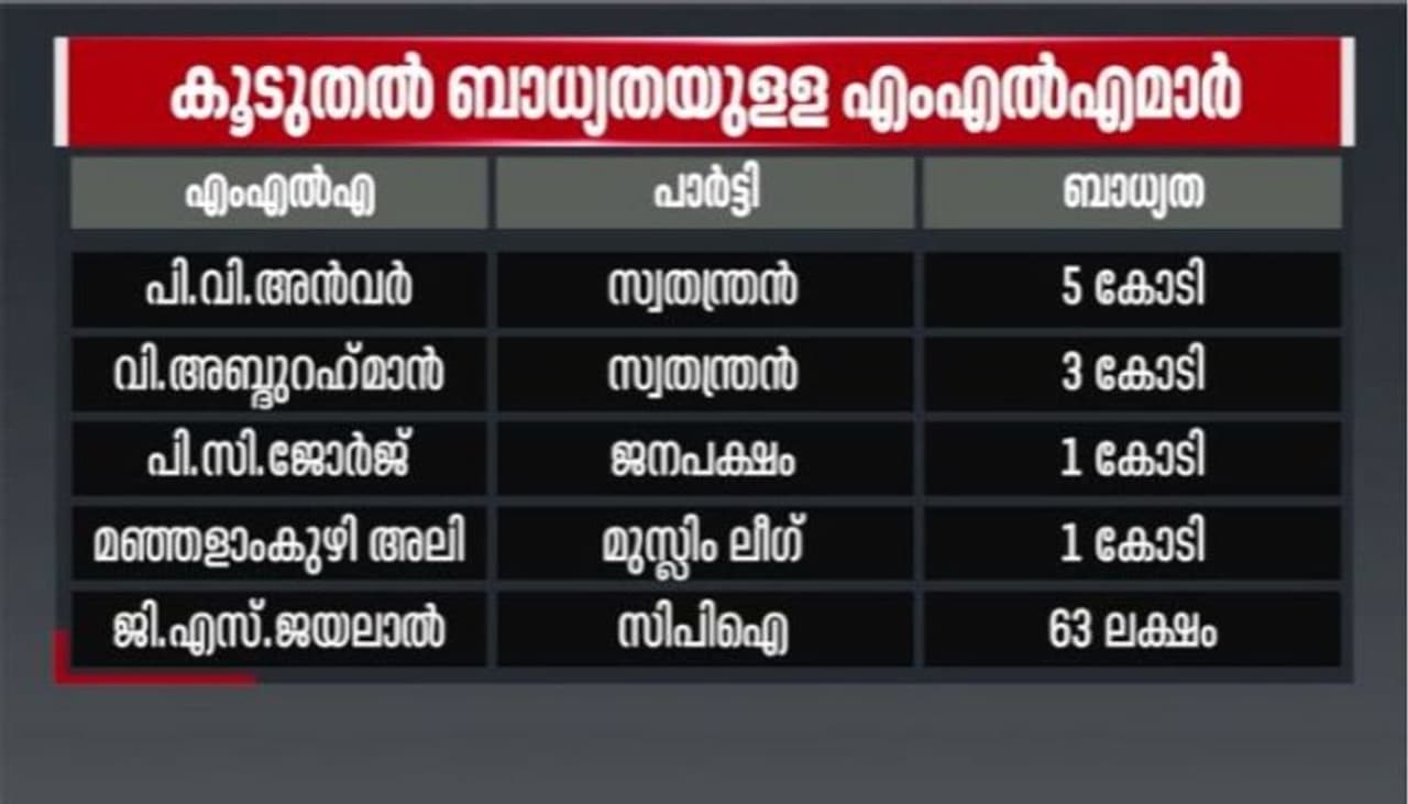 ഏറ്റവും കുറവ് ആസ്തിയുളളത് പട്ടാമ്പി എംഎൽഎ മുഹമ്മദ് മുഹ്സിന്. 46,691 രൂപ. എൽദോ എബ്രഹാം, ആന്റണി ജോൺ, കോവൂർ കുഞ്ഞുമോൻ,ഒ ആർ കേളു എന്നിവർ പിന്നാലെ. ആദ്യ പത്തിൽ ഒൻപതും ഇടത് എംഎൽഎമാർ. സമ്പത്തിനൊപ്പം പിവി അൻവറിന് വലിയ ബാധ്യതയുമുണ്ട്. ഏറ്റവും കൂടുതൽ ബാധ്യതയുളള എംഎൽഎയും അൻവർ തന്നെ. 5 കോടി. പി.വി അബ്ദുറഹ്മാന് മൂന്ന് കോടിയുടെയും പിസി ജോർജിന് ഒരു കോടിയുടെയും ബാധ്യതയുണ്ട്.