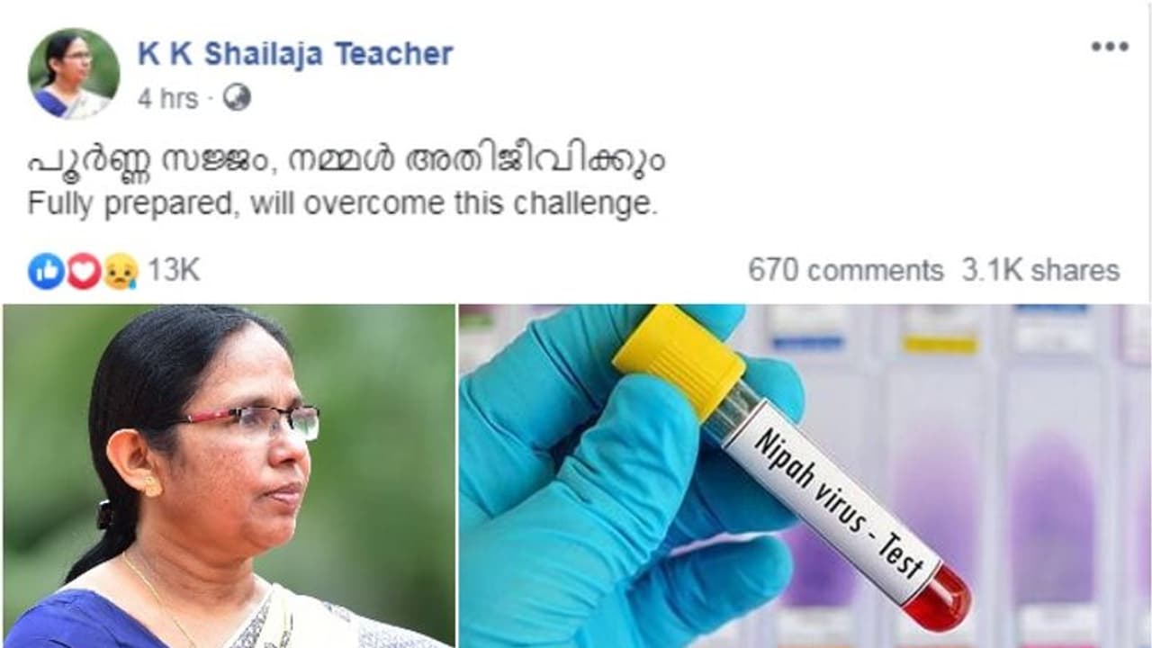 കൊച്ചി: നിപ ബാധയെ നേരിടാനുള്ള എല്ലാ തയ്യാറെടുപ്പുകളും സജ്ജമായി എന്ന് ആരോഗ്യമന്ത്രി കെ കെ ശൈലജയുടെ ഫേസ്ബുക്ക് പോസ്റ്റിലൂടെ അറിയിച്ചു. നിപ ബാധ സ്ഥിരീകരിച്ചതായി വാർത്താ സമ്മേളനം നടത്തി മാധ്യമങ്ങളെ അറിയിച്ചതിന് ശേഷം എഴുതിയ പോസ്റ്റിലാണ് സംസ്ഥാനം നിപയെ നേരിടാൻ പൂർണ്ണ സജ്ജമാണെന്ന് മന്ത്രി ഉറപ്പുനൽകുന്നത്. 'പൂർണ്ണ സജ്ജം, നമ്മൾ അതിജീവിക്കും' എന്ന ഒറ്റവരിയും അതിന്റെ ഇംഗ്ലീഷ് പരിഭാഷയും മാത്രമാണ് ഈ പോസ്റ്റിൽ. മൂവായിരത്തിലേറെ പേർ മന്ത്രിയുടെ ഒറ്റവരി പോസ്റ്റ് പങ്കിട്ടു. കൊച്ചിയിൽ ക്യാമ്പ് ചെയ്ത് ആരോഗ്യമന്ത്രി പ്രതിരോധ പ്രവർത്തനങ്ങൾ ഏകോപിപ്പിക്കുകയാണ്.