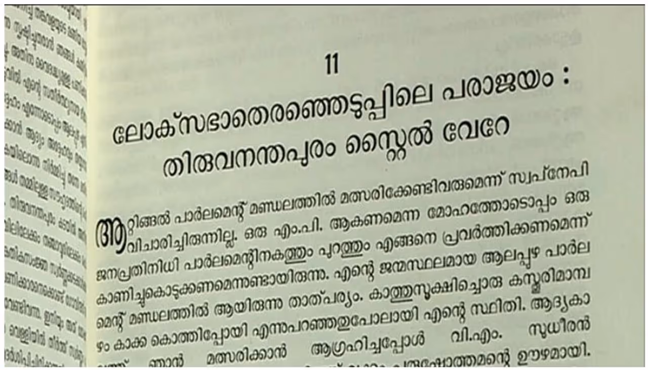 വർക്കല നിയോജകമണ്ഡലത്തിലെ ലീഡ് കൊണ്ടാണ് ജയിക്കേണ്ടതെന്ന് എംഎൽഎ വർക്കല കഹാർ പറഞ്ഞു. 7000 വോട്ടിന്റെ ലീഡ് കിട്ടുമെന്ന് പറഞ്ഞത് താൻ വിശ്വസിച്ചു. എന്നാൽ വർക്കലയിലെ സ്വീകരണപരിപാടികൾ അട്ടിമറിക്കപ്പെട്ടു. ആര്യനാട് എംഎൽഎയും കാട്ടാക്കട എംഎൽഎയും സ്ഥാനാർത്ഥിയുടെ വണ്ടിയിൽ പോലും കയറിയില്ല. തെരഞ്ഞെടുപ്പ് ദിവസവും വോട്ടെണ്ണൽ ദിവസവും കഹാർ ആശുപത്രിയിൽ അജ്ഞാതവാസത്തിലായിരുന്നുവെന്നും പുസ്തകത്തില് പറയുന്നു.