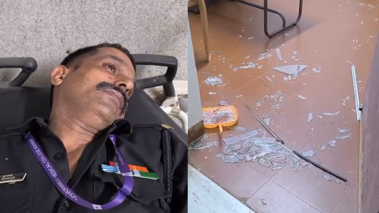 സെക്യൂരിറ്റി ജീവനക്കാരൻ കജേഷ് കുമാറിനെ സംഘം വളഞ്ഞിട്ട് മർദിച്ചു. മർദ്ദനത്തിന് പിന്നാലെ മെഡിക്കൽ കോളേജ് വളപ്പിലെ പോലീസ് ഔട്ട്പോസ്റ്റിന്റെ വാതിലുകളും അടിച്ചുതകർത്തു. ആക്രമണവുമായി ബന്ധപ്പെട്ട് രണ്ട് യുവാക്കളെ പൊലീസ് കസ്റ്റഡിയിലെടുത്തു. മുടിക്കാനം സ്വദേശികളായ ഷിൻ്റോ ബേബി തോമസ്, സാം ഉലഹന്നാൻ എന്നിവരാണ് പിടിയിലായത്. സംഘത്തിലുണ്ടായിരുന്ന മറ്റ് രണ്ടുപേർക്കായി പൊലീസ് തിരച്ചിൽ തുടങ്ങി. മർദനമേറ്റ കുഞ്ഞിമംഗലം സ്വദേശി കജേഷ് കുമാർ ചികിത്സ തേടി.