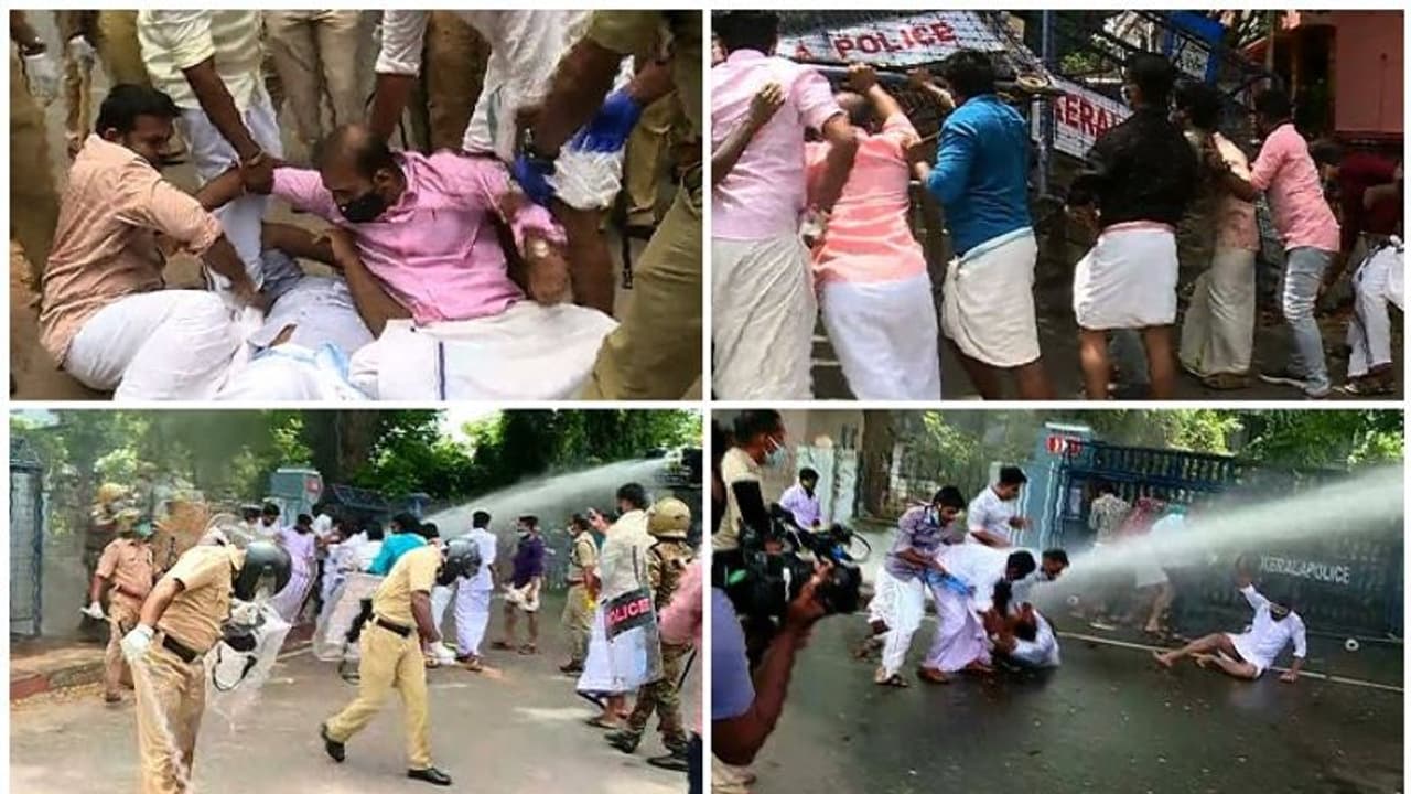 തിരുവനന്തപുരം: കൊവിഡ് പ്രോട്ടോക്കോൾ ലംഘിച്ച് തിരുവനന്തപുരത്ത് അടക്കം സംസ്ഥാനത്തെ വിവിധ ജില്ലകളിൽ വ്യാപകമായ പ്രതിപക്ഷസമരം. കൊല്ലത്ത് കളക്ട്രേറ്റിലേക്ക് നടന്ന കെഎസ്യു മാർച്ചിൽ സംഘർഷമുണ്ടായി. പ്രവർത്തകർക്ക് നേരെ പൊലീസ് ജലപീരങ്കി പ്രയോഗിച്ചു. എറണാകുളം കമ്മീഷണർ ഓഫീസിലേക്ക് യൂത്ത് കോൺഗ്രസ് നടത്തിയ പ്രതിഷേധത്തിലും നേരിയ സംഘർഷമുണ്ടായി. ഷാഫി പറമ്പിൽ എംഎൽഎ ഉദ്ഘാടനം ചെയ്ത സമരത്തിൽ പിവിസി പൈപ്പ് കൊണ്ട് ചതുരം ഉണ്ടാക്കി അതിനുള്ളിൽ നിന്നായിരുന്നു പ്രവർത്തകർ പ്രതിഷേധിച്ചത്.