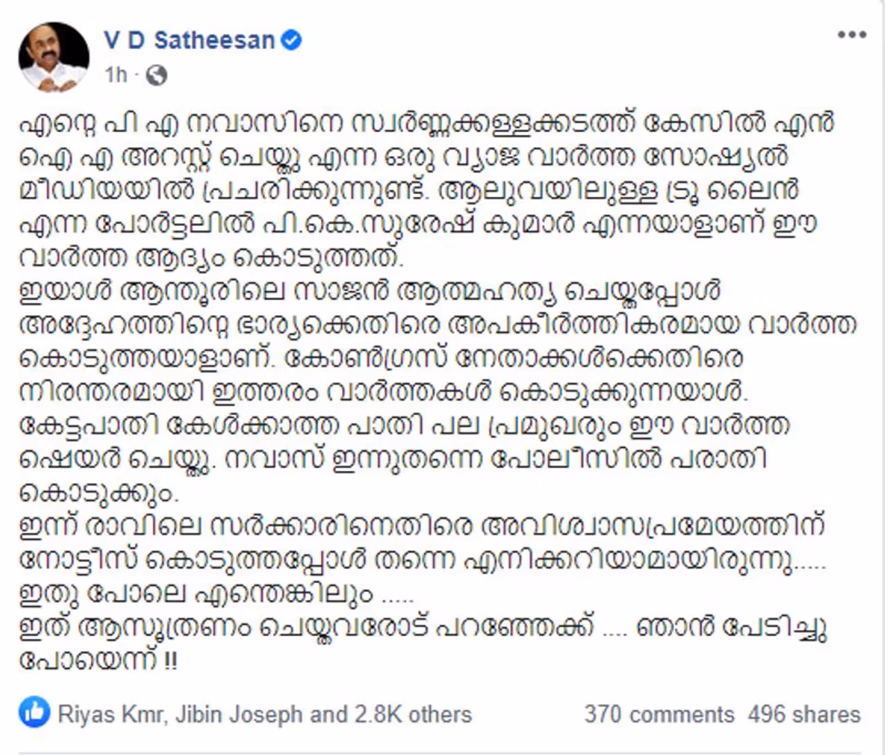 എന്റെ പിഎ നവാസിനെ സ്വർണ്ണക്കള്ളക്കടത്ത് കേസിൽ എൻഐഎ അറസ്റ്റ് ചെയ്തു എന്ന ഒരു വ്യാജ വാർത്ത സോഷ്യൽ മീഡിയയിൽ പ്രചരിക്കുന്നുണ്ട്. ആലുവയിലുള്ള ട്രൂ ലൈൻ എന്ന പോർട്ടലിൽ പി കെ സുരേഷ് കുമാർ എന്നയാളാണ് ഈ വാർത്ത ആദ്യം കൊടുത്തത്. ഇയാൾ ആന്തൂരിലെ സാജൻ ആത്മഹത്യ ചെയ്തപ്പോൾ അദ്ദേഹത്തിന്റെ ഭാര്യക്കെതിരെ അപകീർത്തികരമായ വാർത്ത കൊടുത്തയാളാണ്. കോൺഗ്രസ് നേതാക്കൾക്കെതിരെ നിരന്തരമായി ഇത്തരം വാർത്തകൾ കൊടുക്കുന്നയാൾ. കേട്ടപാതി കേൾക്കാത്ത പാതി പല പ്രമുഖരും ഈ വാർത്ത ഷെയർ ചെയ്തു. നവാസ് ഇന്നുതന്നെ പൊലീസിൽ പരാതി കൊടുക്കും. ഇന്ന് രാവിലെ സർക്കാരിനെതിരെ അവിശ്വാസപ്രമേയത്തിന് നോട്ടീസ് കൊടുത്തപ്പോൾ തന്നെ എനിക്കറിയാമായിരുന്നു... ഇതുപോലെ എന്തെങ്കിലും... ഇത് ആസൂത്രണം ചെയ്തവരോട് പറഞ്ഞേക്ക്... ഞാൻ പേടിച്ചു പോയെന്ന് !!