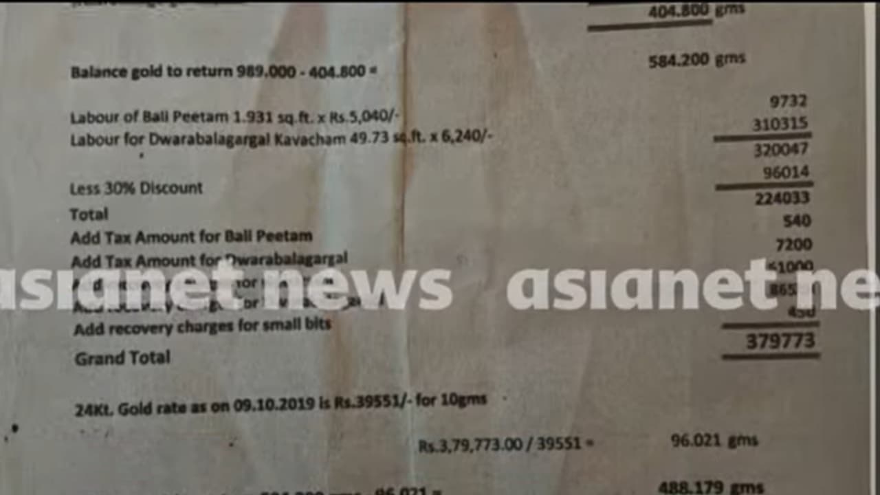 സൈഡ് പാളികളിൽ നിന്ന് 409 ഗ്രാം സ്വര്ണം കിട്ടി, അതിന്റെ റിക്കവറി ചാര്ജായി 61,000 സ്മാര്ട്ട് ക്രിയേഷൻസ് ഈടാക്കിയത്. മാത്രമല്ല, ദ്വാരപാലക പാളികള്, അതിൽ 14 പീസസ് ആണ് കിട്ടിയത്. അതിൽ നിന്ന് 577 ഗ്രാം സ്വര്ണം വേര്തിരിച്ചിട്ടുണ്ട്. മറ്റുള്ളവയിൽ നിന്ന് ഏകദേശം 3 ഗ്രാം. അങ്ങനെ 989 ഗ്രാം സ്വര്ണം. അതായത് ഒരു കിലോയോളം സ്വര്ണം ദ്വാരപാലക പാളിയിൽ നിന്നും സൈഡ് പാളിയിൽ നിന്നും മാത്രം സ്മാര്ട്ട് ക്രിയേഷൻസിൽ വേര്തിരിച്ചു എന്നാണ് കണക്ക്. പിന്നീട് പണിക്കൂലിയായി സ്വര്ണം തന്നെയാണ് ഇവരെടുക്കുന്നത്. 3 ലക്ഷത്തിലധികം രൂപയാണ് അവര് പണിക്കൂലിയായി കാണിച്ചിരിക്കുന്നത്. 96.021 ഗ്രാം സ്വര്ണമാണ് സ്മാര്ട്ട് ക്രിയേഷൻസ് പണിക്കൂലിയായി എടുത്തെന്നാണ് രേഖയിലുള്ളത്. സ്വര്ണമൊന്നും എത്തിയില്ലെന്ന് പറഞ്ഞ സ്മാര്ട്ട് ക്രിയേഷൻസിന്റെ കയ്യിൽ നിന്നാണ് ഈ രേഖ പിടിച്ചെടുത്തിരിക്കുന്നത്.