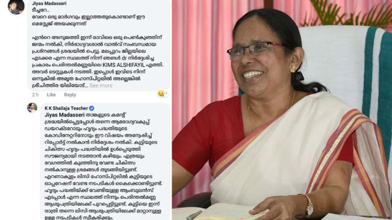 കമന്റ് ശ്രദ്ധയിൽപെട്ട ഉടൻ മന്ത്രി ഉന്നത ഉദ്യോഗസ്ഥർക്ക് ഇത് സംബന്ധിച്ച് പരിശോധിക്കാൻ നിർദ്ദേശം നൽകുകയും, സംഭവം സത്യമാണെന്ന് മനസിലായതോടെ ഇന്നലെ രാത്രി തന്നെ കൊച്ചിയിലേക്ക് മാറ്റുകയുമായിരുന്നു. ഇന്നലെ പുലർച്ചെ ഒന്നരയോടെയാണ് കുഞ്ഞിനെ എറണാകുളത്തെ ലിസി ആശുപത്രിയിൽ എത്തിച്ചത്. കുഞ്ഞിന് രണ്ട് ദിവസം മാത്രമാണ് പ്രായം. മലപ്പുറം ജില്ലയിലെ എടക്കര സ്വദേശികളാണ് കുഞ്ഞിന്റെ കുടുംബം. ഇവർ പെരിന്തൽമണ്ണ കിംസ് അൽ ഷിഫ ആശുപത്രിയിൽ ചികിത്സയിൽ കഴിയുകയായിരുന്നു.