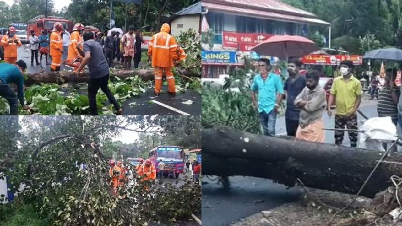 കൊച്ചി: എറണാകുളത്ത് അതിശക്തമായ കാറ്റും മഴയും. കോതമംഗലം നെല്ലിമറ്റത്ത് ശക്തമായ കാറ്റിൽ മരങ്ങൾ കടപുഴകി വീണു. കൊച്ചി-ധനുഷ്കോടി ദേശീയ പാതയിൽ നിരവധി മരങ്ങളാണ് വീണത്. ഒരു മണിക്കൂറോളം ഗതാഗതം നിലച്ചു. ഫയർഫോഴ്സ് എത്തി മരങ്ങൾ റോഡിൽ നിന്ന് മുറിച്ച് മാറ്റിയാണ് ഗതാഗതം പുനസ്ഥാപിച്ചത്.