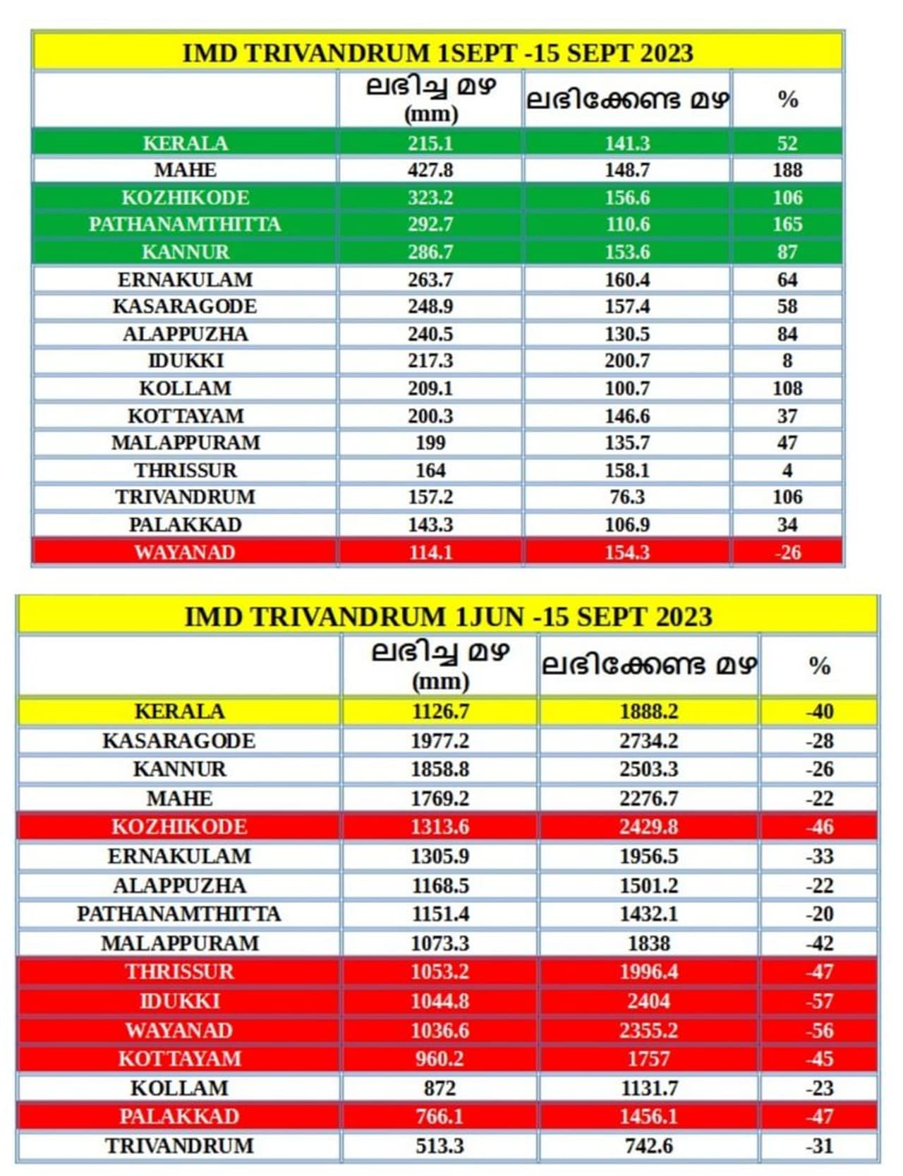 ജൂൺ ഒന്ന് മുതൽ ഇന്ന് വരെയുള്ള കണക്ക് പ്രകാരം സംസ്ഥാനത്ത് ആകെ ഇതുവരെ കുറവ് 40 ശതമാനമാണ്. ഓഗസ്റ്റ് അവസാനിക്കുബോൾ 48 ശതമാനം കുറവുണ്ടായിരുന്നിടത്ത് സെപ്തംബറിൽ 15 ദിവസം പിന്നിടുമ്പോൾ 40 ശതമാനം ആയി കുറഞ്ഞു. സംസ്ഥാനത്ത് ഇതുവരെ ഏറ്റവും കൂടുതൽ അളവിൽ മഴ ലഭിച്ചത് കാസർകോഡാണ്. ആകെ 1977 മില്ലിമീറ്റർ ( 1977 mm) മഴ ഇവിടെ ലഭിച്ചു. ഏറ്റവും കുറവ് സംസ്ഥാന തലസ്ഥാനമായ തിരുവനന്തപുരത്താണ്. ഇവിടെ ആകെ 513 മില്ലീമീറ്റർ ( 513MM) മഴ മാത്രമാണ് ലഭിച്ചത്. അതേസമയം, ലഭിക്കേണ്ട മഴയുടെ കണക്കിൽ ഏറ്റവും കുറവ് രേഖപ്പെടുത്തിയത് ഇടുക്കി ( 57% കുറവ് ) വയനാട് ( 56) തൃശൂർ (47), പാലക്കാട് (47), കോഴിക്കോട് (46) ജില്ലകളിലാണ്.