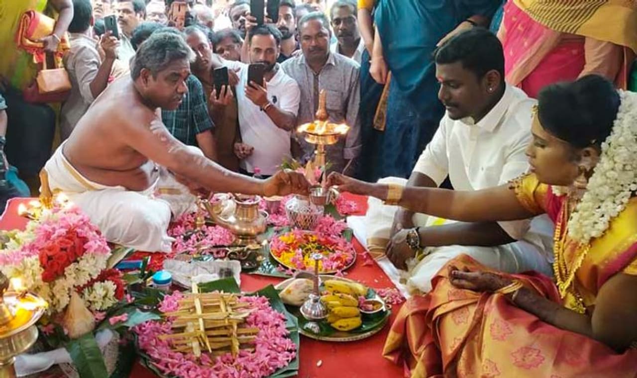 കഴിഞ്ഞ വർഷം ഹൃദയാഘാതം വന്നാണ് അഞ്ജുവിന്റെ അച്ഛൻ അശോകൻ മൂന്നുമക്കളെയും ഭാര്യ ബിന്ദുവിനെയും വിട്ടുപിരിഞ്ഞത്. മൂത്തമകളായ അഞ്ജുവിന്റെ വിവാഹം നടത്താൻ മറ്റ് വഴികളൊന്നുമില്ലാതെ വന്നപ്പോഴാണ് വീടിന് സമീപത്തുള്ള മുസ്ലീം ജമാ അത്ത് പള്ളിക്കമ്മറ്റിയെ ബിന്ദു സമീപിക്കുന്നത്. വിവാഹത്തിന് സഹായം നൽകാമെന്ന വെറുംവാക്കല്ല, പള്ളിക്കമ്മറ്റി അംഗങ്ങൾ പറഞ്ഞത്. വിവാഹത്തിന്റെ എല്ലാ ചെലവുമുൾപ്പെടെ ആഘോഷപൂർവ്വം നടത്തിത്തരാമെന്നാണ്. ക്ഷണക്കത്ത് മുതൽ ഭക്ഷണവും ആഭരണങ്ങളും ഉൾപ്പെടെ ഒരുക്കി ജമാ അത്ത് കമ്മറ്റിയുടെ നേതൃത്വത്തില് വിവാഹ ഒരുക്കങ്ങള് നടത്തിയപ്പോള് നാടൊരുമിച്ച് നിന്നു. മുഖ്യമന്ത്രി പിണറായി വിജയനും ഫേസ്ബുക്ക് പോസ്റ്റിലൂടെ വധൂവരന്മാർക്ക് ആശംസകൾ നേർന്നു.