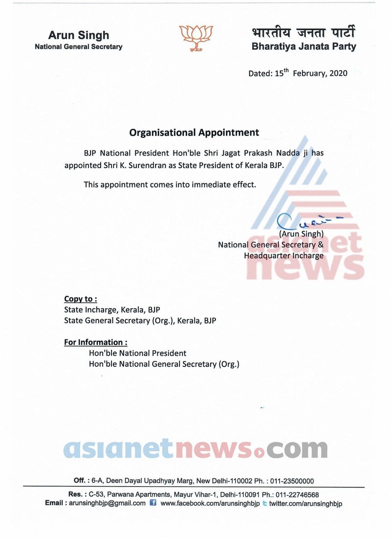 ഉപതെരഞ്ഞെടുപ്പുകൾക്ക് ശേഷം പിഎസ് ശ്രീധരൻ പിള്ള മിസോറാം ഗവര്ണറായി നിയമിതനായ ശേഷം സംസ്ഥാന ബിജെപി അധ്യക്ഷ സ്ഥാനം ഒഴിഞ്ഞ് കിടക്കുകയായിരുന്നു. മാസങ്ങൾക്ക് ശേഷമാണ് നിലവിൽ സംസ്ഥാന ജനറൽ സെക്രട്ടറിയായ കെ സുരേന്ദ്രനെ അധ്യക്ഷനായി തീരുമാനിച്ചത്.