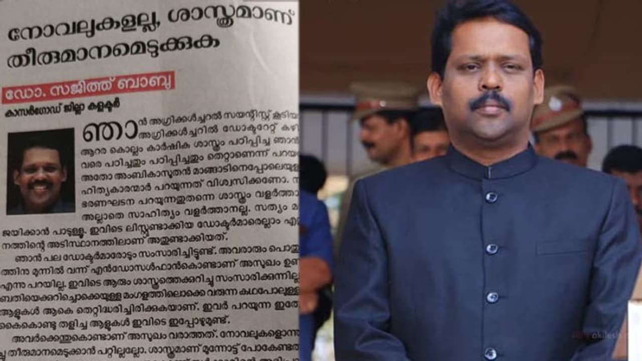 അതില് എഴുതിവച്ചിരിക്കുന്നതിനെക്കുറിച്ച് തനിക്ക് അറിയില്ല, ആരെങ്കിലും എന്തെങ്കിലുമൊക്കെ എഴുതിവച്ചിരിക്കുന്നതിന് താനാണോ സമാധാനം പറയേണ്ടതെന്ന് കാസര്കോട് കളക്ടര് സജിത്ത് ബാബു
