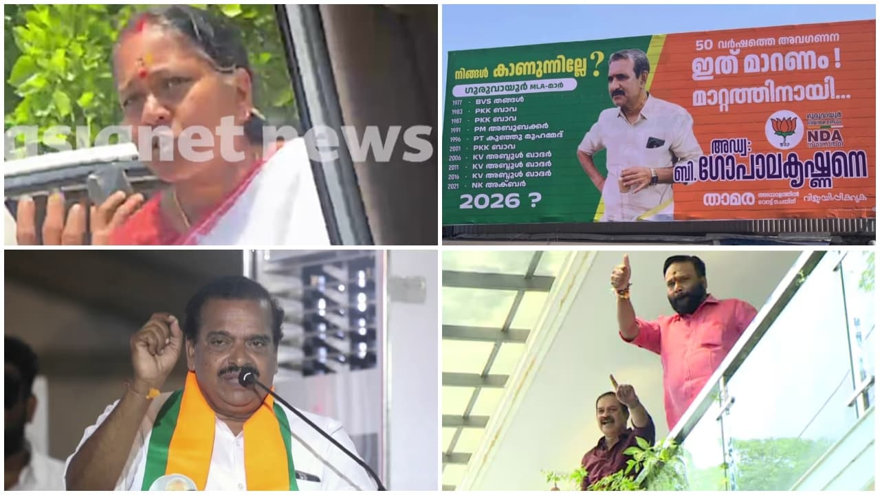 ഗുരുവായൂർ മണ്ഡലത്തിൽ ബിജെപി സ്ഥാനാർത്ഥിയായ ബി ഗോപാലകൃഷ്ണന്റെ പരാമർശം വലിയ വിവാദമായിരുന്നു. ക്ഷേത്ര നഗരി എന്ന് കേൾവി കേട്ട ഗുരുവായൂരിൽ കഴിഞ്ഞ കുറേ കാലങ്ങളായി ഒരു ഹിന്ദു എംഎൽഎ ഉണ്ടായിട്ടില്ല എന്നായിരുന്നു ഗോപാലകൃഷ്ണന്റെ പരാമർശം. വിവാദ പരാമര്ശത്തിൽ കേസ് രജിസ്റ്റര് ചെയ്തതിന് പിന്നാലെ ഗുരുവായൂരില് ഉയര്ന്ന ബിജെപിയുടെ ഫ്ലക്സ് വീണ്ടും വിവാദമായി. 1977 മുതൽ ഗുരുവായൂര് മണ്ഡലത്തിലുണ്ടായിരുന്ന എംഎൽഎമാരുടെ പേരുകൾ പട്ടികയായി കൊടുത്ത ഫ്ലക്സാണ് ഉയര്ന്നത്. എന്നാൽ, പച്ച നിറത്തിലുള്ള ഭാഗത്ത് എംഎൽഎമാരുടെ പേരും കാവി നിറമുള്ള ഭാഗത്ത് ഇത് മാറണം എന്നുമാണ് പറഞ്ഞിരുന്നത്. ഇത്തരം ബോർഡ് വർഗീയത പ്രചരിപ്പിക്കുന്നതാണെന്ന് വിമർശിച്ച് യുഡിഎഫും എൽഡിഎഫും രംഗത്തെത്തിയിരുന്നു.