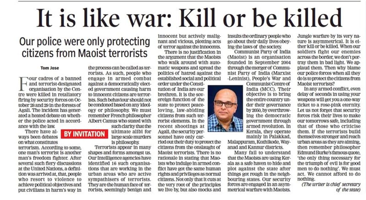 മാവോയിസ്റ്റുകൾ തീവ്രവാദികൾ തന്നെയെന്നും ജനാധിപത്യ സർക്കാരിനെ അട്ടിമറിക്കാനുള്ള ശ്രമമാണ് നടക്കുന്നതെന്നും ഒരു ഇംഗ്ലീഷ് ദിനപ്പത്രത്തിലെഴുതിയ ലേഖനത്തില് അദ്ദേഹം അഭിപ്രായപ്പെട്ടു. അട്ടപ്പാടിയിലെ മാവോയിസ്റ്റുകളുടെ കൊലപാതകം വലിയ വിവാദമായതിനിടെയാണ് പൊലീസ് നടപടിയെ ന്യായീകരിച്ച് ചീഫ് സെക്രട്ടറി രംഗത്തെത്തിയത്. മാവോയിസ്റ്റുകള് തീവ്രവാദികള്തന്നെയാണെന്നും ജനാധിപത്യരീതിയില് പ്രവര്ത്തിക്കുന്ന സര്ക്കാറുകളെ അട്ടിമറിക്കാനുള്ള ശ്രമമാണ് നടക്കുന്നതെന്നും അതിനാല് മാവോയിസ്റ്റുകളുടെ രീതികളെ ന്യായീകരിക്കാന് സാധിക്കില്ലെന്നുമാണ് അദ്ദേഹം ലേഖനത്തില് വ്യക്തമാക്കുന്നത്.