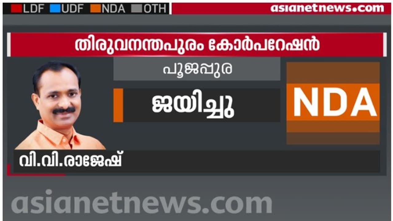 തിരുവനന്തപുരം: തിരുവനന്തപുരം പൂജപ്പുര വാർഡിൽ ബിജെപി നേതാവ് വി വി രാജേഷ് വിജയിച്ചു. അഭിമാനപോരാട്ടമായി തിരുവനന്തപുരത്തെ മത്സരം കണക്കാക്കിയിരുന്ന ബിജെപി സംസ്ഥാനതലത്തിലെ നേതാക്കളെത്തന്നെയാണ് തദ്ദേശതെരഞ്ഞെടുപ്പിലും പലയിടങ്ങളിലായി മത്സരിപ്പിച്ചത്. തിരുവനന്തപുരത്തെ സിറ്റിംഗ് സീറ്റായ പൂജപ്പുരയിൽത്തന്നെ വി വി രാജേഷിനെ ബിജെപി മത്സരിപ്പിച്ചതും അതുകൊണ്ടാണ്. യുഡിഎഫ് സ്ഥാനാർത്ഥിയായ കെ എസ് വിനു രണ്ടാം സ്ഥാനത്താണ്. സിപിഐ മൂന്നാം സ്ഥാനത്തേക്ക് പിന്തള്ളപ്പെട്ടു.