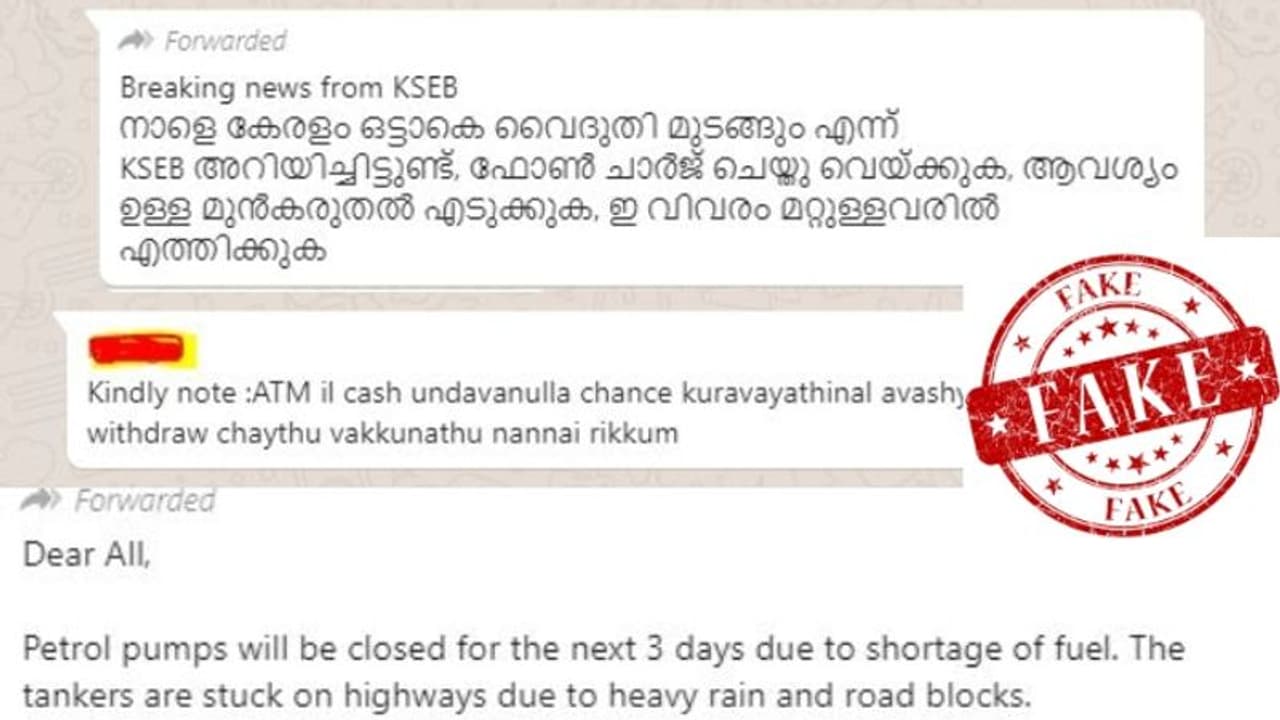 നാളെ കേരളത്തില് വൈദ്യുതിയുണ്ടാവില്ലെന്ന് കെഎസ്ഇബി അറിയിച്ചു, എടിഎമ്മില് പണം ഉണ്ടാവില്ല എന്നൊക്കെയാണ് സമൂഹമാധ്യമങ്ങളില് ഇപ്പോള് പ്രചരിക്കുന്ന വ്യാജവാര്ത്തകള്. ഇത്തരം സന്ദേശങ്ങള് ഫോര്വേര്ഡ് ചെയ്താല് കര്ശന നടപടിയുണ്ടാവുമെന്ന് പൊലീസ് മുന്നറിയിപ്പ് നല്കുന്നു.