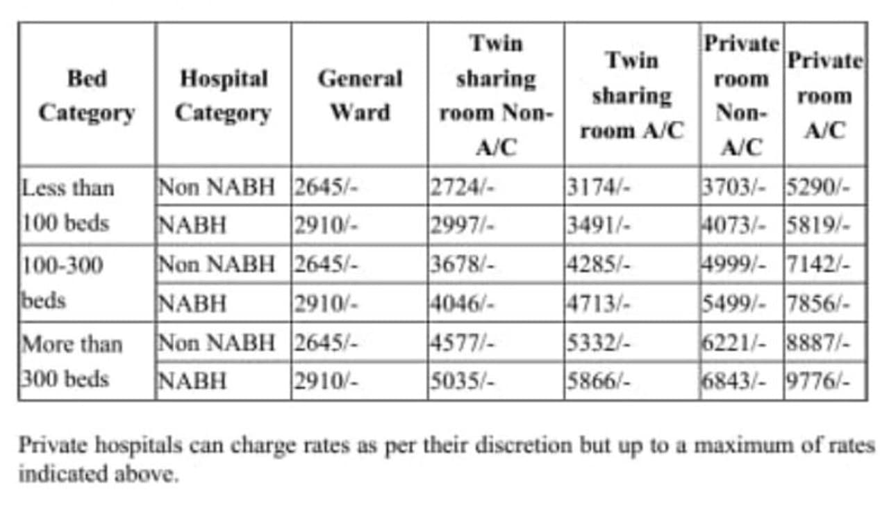100 കിടക്കയുള്ള എൻഎബിഎച്ച് അംഗീകരാമില്ലാത്ത ആശുപത്രികളിൽ ജനറൽ വാർഡിന് പരമാവധി 2645 രൂപയും എസി മുറികൾക്ക് 5290 രൂപയും ഈടാക്കാം. ഡോക്ടറുടെ സന്ദർശന ഫീസ്, നഴ്സിംഗ്, റജിസ്ട്രഷൻ, മരുന്നുകൾ, എക്സറേ എന്നിവയല്ലാം ഈ നിരക്കിനുള്ളിൽ വരേണ്ടതാണ്. എന്നാൽ ഉയർന്ന പരിശോധനകൾ, സിടി സ്കാൻ, പിപിഇ കിറ്റ് എന്നിവ നിരക്കിനുള്ളിൽ വരില്ല. ഇവയ്ക്ക് സർക്കാർ നിശ്ചയിച്ച് നൽകിയ റേറ്റ് ഈടാക്കാനാകും.
