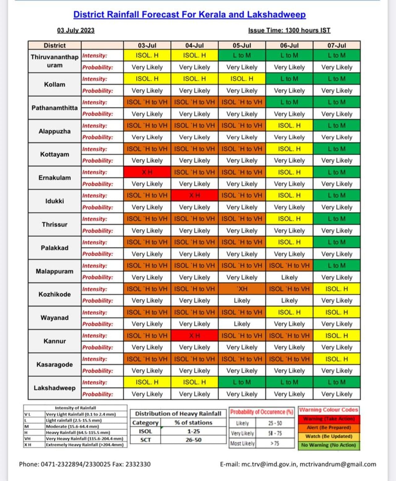 കേരള തീരത്ത് (വിഴിഞ്ഞം മുതൽ കാസർഗോഡ് വരെ) 04.07.2023 രാത്രി 11.30 വരെ 3.0 മുതൽ 3.4 മീറ്റർ വരെ ഉയരത്തിൽ തിരമാലയ്ക്കും കടലാക്രമണത്തിനും സാധ്യതയുണ്ടെന്നും ആയതിന്റെ വേഗത സെക്കൻഡിൽ 45 cm നും 55 cm നും ഇടയിൽ മാറി വരുവാൻ സാധ്യതയുണ്ടെന്നും ദേശീയ സമുദ്രസ്ഥിതിപഠന ഗവേഷണ കേന്ദ്രം (INCOIS) അറിയിച്ചു.