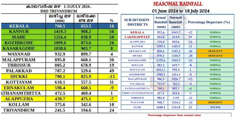 അതേസമയം, ജൂൺ ഒന്ന് മുതൽ ജൂലൈ 31 വരെയുള്ള കണക്കുപ്രകാരം സംസ്ഥാനത്ത് നാല് ശതമാനം മഴക്കുറവ് രേഖപ്പെടുത്തി. 1301.7 മി.മീറ്റർ ലഭിക്കേണ്ട സ്ഥാനത്ത് 1249.7 മി.മീറ്റർ മഴയാണ് ലഭിച്ചത്. കണ്ണൂർ (22 ശതമാനം അധികം), പാലക്കാട് (15 ശതമാനം അധികം) ജില്ലകളിലാണ് ഏറ്റവും കൂടുതൽ മഴ പെയ്തത്. ഇടുക്കി(-25), എറണാകുളം (-22), ആലപ്പുഴ (-17), വയനാട്(-15) എന്നീ ജില്ലകളിലാണ് മഴക്കുറവ്.