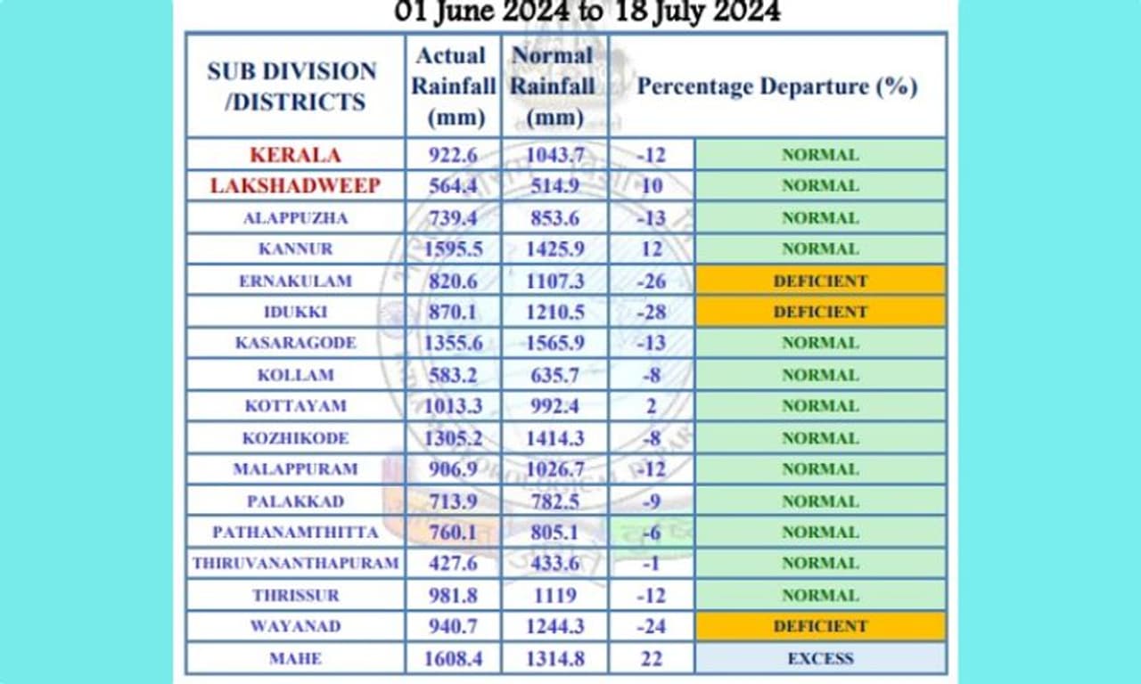 എറണാകുളത്ത് 26 ശതമാനവും ഇടുക്കിയിൽ 28 ശതമാനവുമാണ് മഴക്കുറവ്. വയനാട്ടിൽ 24 ശതമാനം കുറവും രേഖപ്പെടുത്തി.