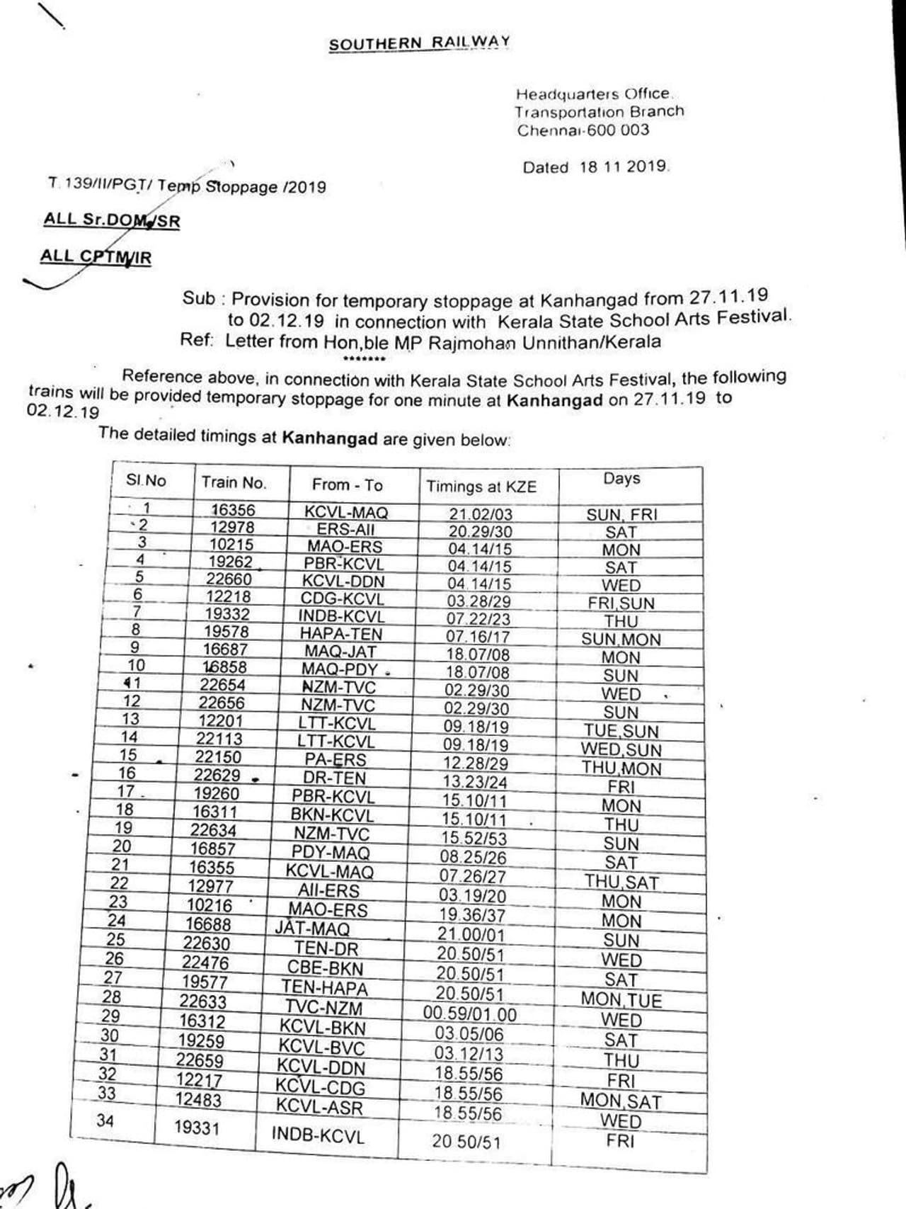 തിരുവനന്തപുരം: കേരള സംസ്ഥാന സ്കൂൾ കലോത്സവത്തിന് വിദ്യാര്ത്ഥികൾക്ക് സുഗമമായ യാത്രാ സൗകര്യം ഒരുക്കാനായി കൂടുതൽ ട്രെയിനുകൾക്ക് കാഞ്ഞങ്ങാട് സ്റ്റോപ്പ് അനുവദിച്ചു. രാജ്മോഹൻ ഉണ്ണിത്താൻ എംപി യുടെ അഭ്യര്ത്ഥന മാനിച്ചാണ് റെയിൽവെ തീരുമാനം.