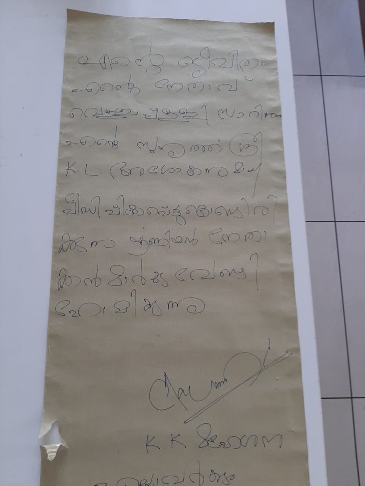 വെള്ളാപ്പള്ളി നടേശന്റെയും അശോകന്റെയും പേരുള്ള കുറിപ്പാണ് പുറത്തുവന്നത്. തൂങ്ങിമരിച്ച ഓഫീസ് മുറിയിലെ ഭിത്തിയിൽ ഒട്ടിച്ചിരുന്ന കുറിപ്പാണിത്.