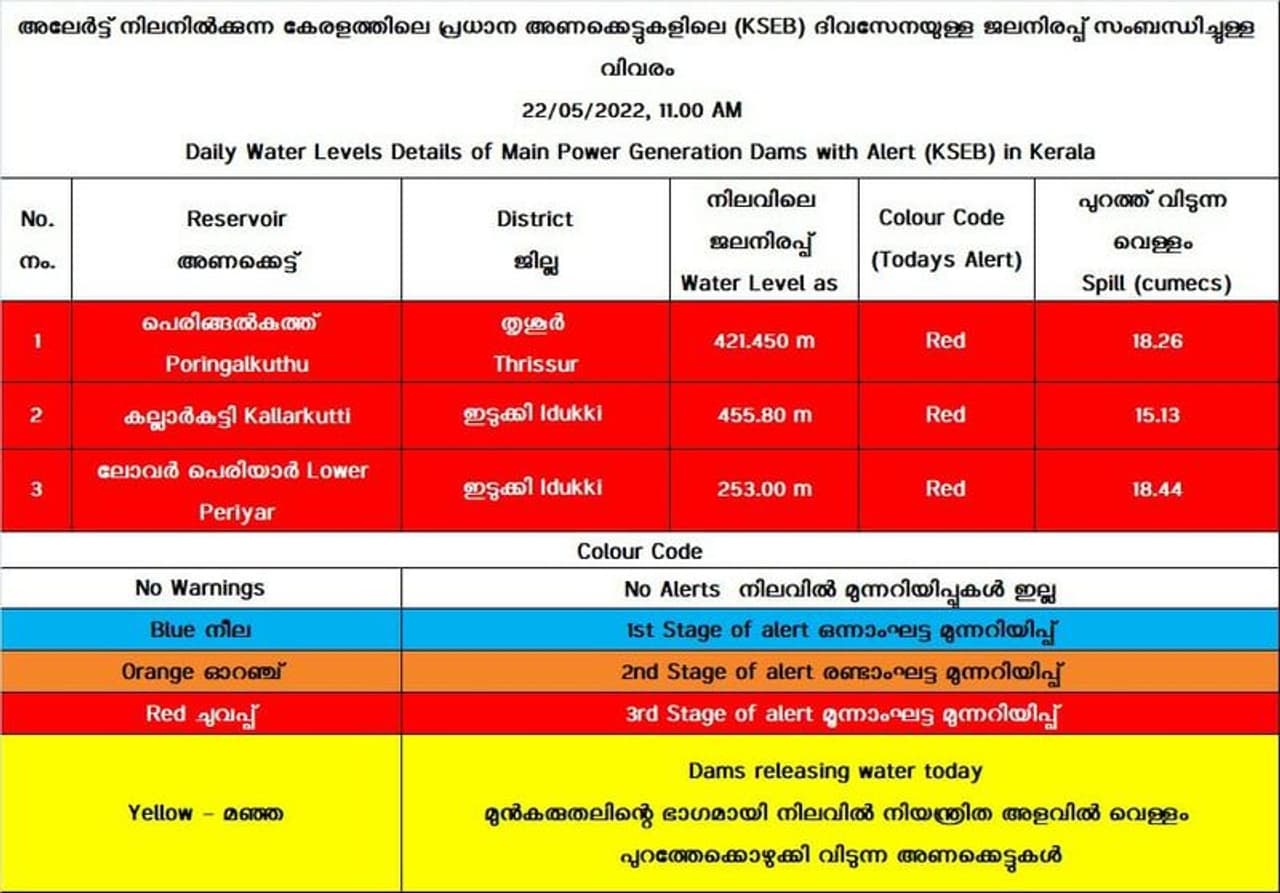 വ്യഷ്ടിപ്രദേശങ്ങളിൽ മഴ തുടരുന്ന സാഹചര്യത്തിൽ മൂന്ന് ഡാമുകളിൽ കെഎസ്ഇബി റെഡ് അലർട്ട് പ്രഖ്യാപിച്ചു.