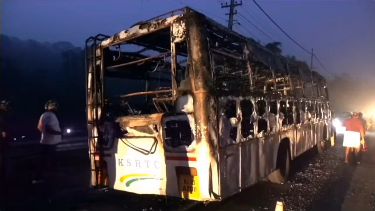 മലപ്പുറത്തു നിന്ന് ഗവിയിലേക്ക് പോയ ഉല്ലാസയാത്ര ബസ് ആണ് കത്തിയത്. സംഭവത്തിൽ യാത്രക്കാർക്ക് ആർക്കും പരിക്കില്ലെന്നാണ് വിവരം. ബസിൽ നിന്ന് പുക ഉയരുന്നത് കണ്ട് വാഹനം നിർത്തി യാത്രക്കാരെ പുറത്തിറക്കിയിരുന്നു.