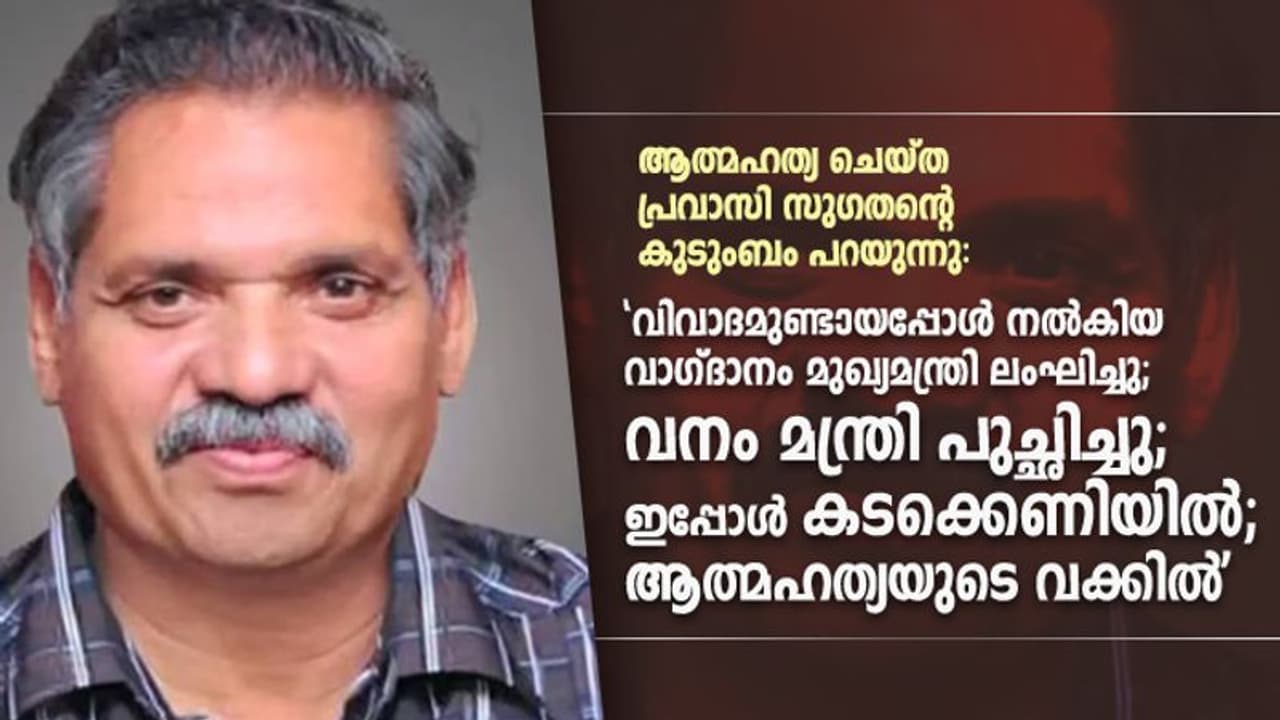 ആത്മഹത്യ ചെയ്ത പ്രവാസി സുഗതന്റെ കുടുംബം പറയുന്നു: 'വിവാദമുണ്ടായപ്പോള് നല്കിയ വാഗ്ദാനം മുഖ്യമന്ത്രി ലംഘിച്ചു; വനം മന്ത്രി പുച്ഛിച്ചു; ഇപ്പോള് കടക്കെണിയില്; ആത്മഹത്യയുടെ വക്കില്. നിര്മല ബാബുവിന്റെ റിപ്പോര്ട്ട്