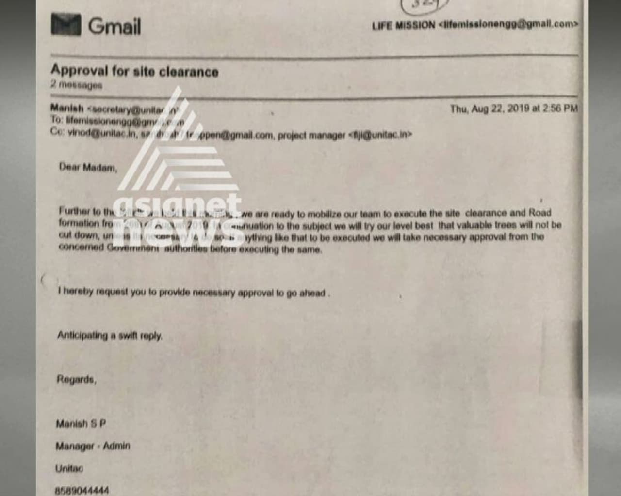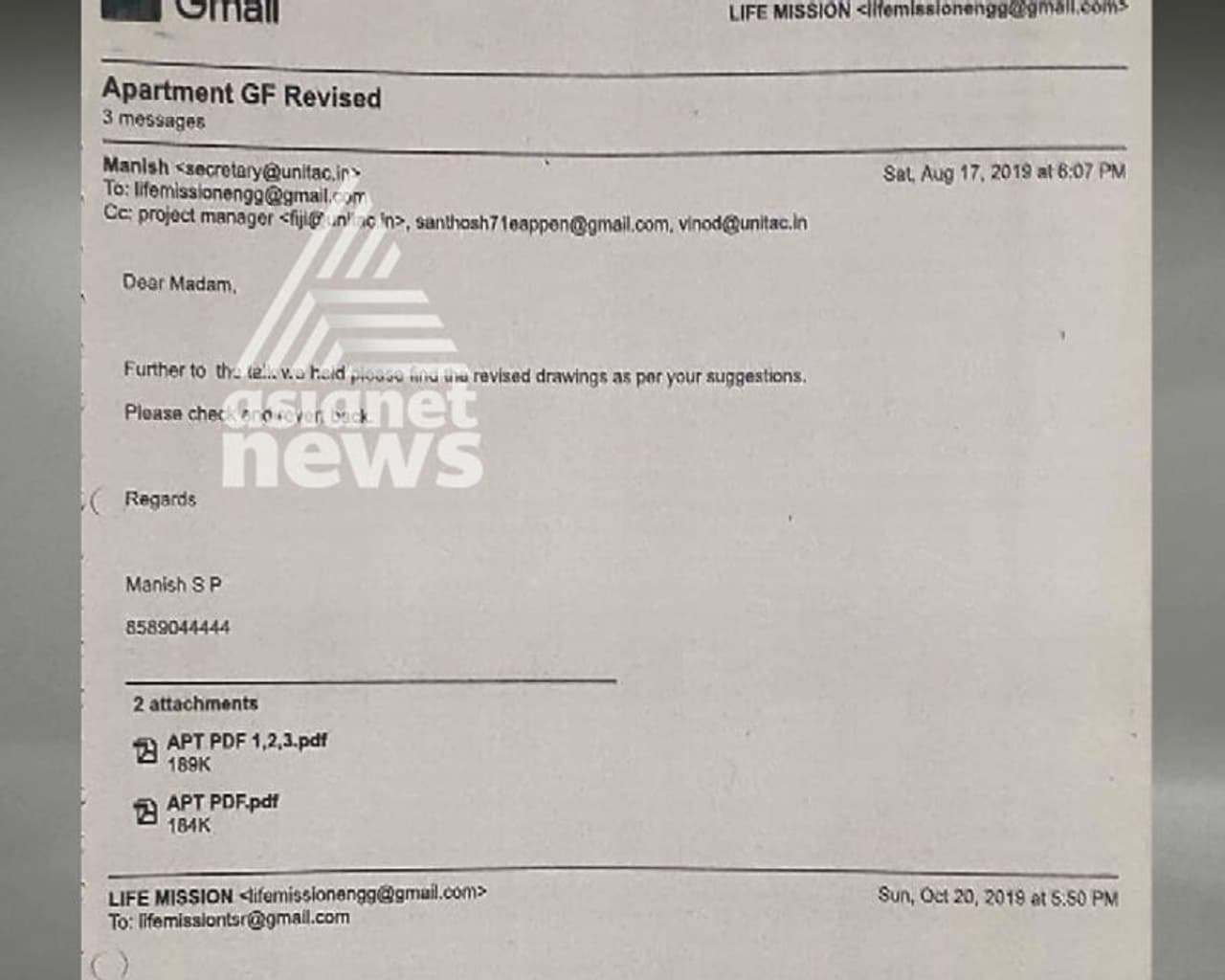 കഴിഞ്ഞ ഓഗസ്റ്റ് 17നാണ് യൂണിടാക്ക് അഡ്മിൻ മാനേജർ മനീഷ് രൂപരേഖ ലൈഫ് മിഷന് നൽകുന്നത്. പിന്നാലെ ഫ്ലാറ്റ് നിർമ്മിക്കുന്ന സ്ഥലത്തെ വിലയേറിയ മരങ്ങൾ മുറിക്കില്ലെെന്ന് ഉറപ്പ് നൽകിയ 22ന് ഇ മെയിൽ. അന്ന് തന്നെ ലൈഫ് മിഷൻ യൂണിടാക്കിന് നൽകുന്ന മറുപടിയിൽ രൂപരേഖയിൽ ആദ്യമായി സംതൃപ്തി രേഖപ്പെടുത്തുന്നു. ഒപ്പം നിർമ്മാണവുമായി മുന്നോട്ട് പോകാമെന്ന അനുമതിയും.