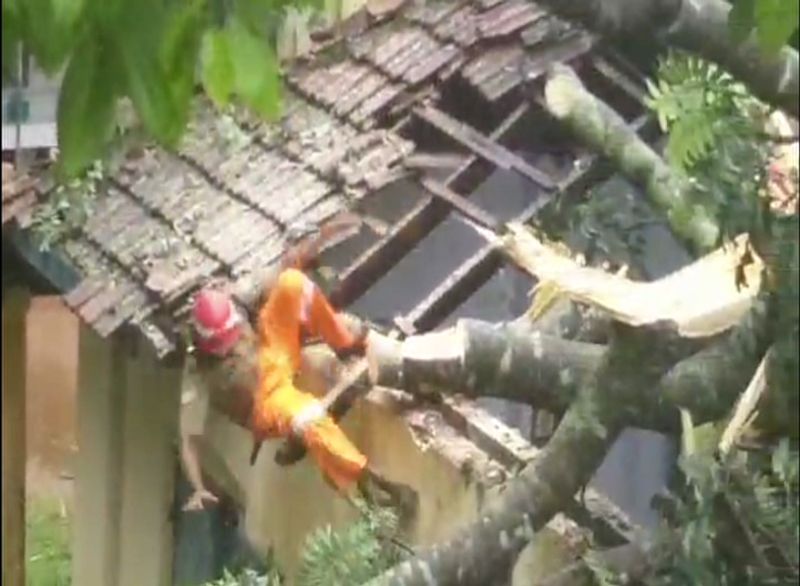 മരം മുറിച്ചു നീക്കുന്നതിനിടെ ഫയർ ഫോഴ്സ് ജീവനക്കാരന് താഴെ വീണു - വീഡിയോ