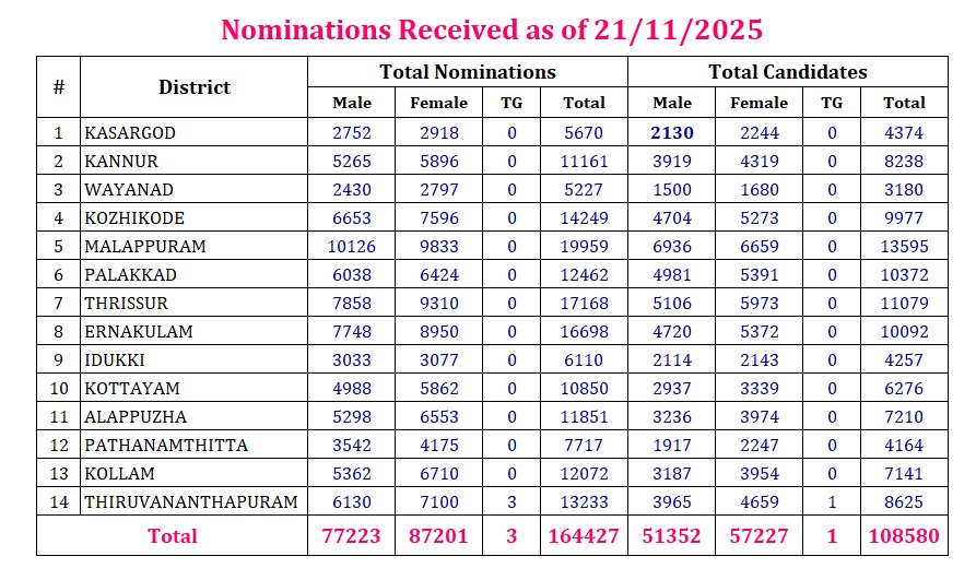 നാമനിര്ദേശ പത്രിക സമര്പ്പിക്കുന്നതിനുള്ള അവസാന ദിവസമായ ഇന്ന് ഏറ്റവും ഒടുവിലത്തെ കണക്ക് പ്രകാരം സംസ്ഥാനത്താകെ 1,64,427 പത്രികകളാണ് സമർപ്പിച്ചത്. മലപ്പുറം ജില്ലയിലാണ് ഏറ്റവും കൂടുതൽ പത്രികകൾ സലമർപ്പിച്ചിരിക്കുന്നത്. 19959 പത്രികകളാണ് ജില്ലയിലാകെ ലഭിച്ചത്. വയനാട് ജില്ലയിലാണ് ഏറ്റവും കുറവ് പത്രിക സമര്പ്പിച്ചത്. 5227 പേരാണ് വയനാട്ടിൽ പത്രിക നൽകിയത്. പലയിടത്തും മുന്നണികൾക്ക് ഭീഷണിയായി വിമതർ രംഗത്തുണ്ട്.നാളെയാണ് സൂക്ഷ്മപരിശോധന. പത്രിക പിൻവലിക്കാനുള്ള സമയ പരിധി തിങ്കളാഴ്ചയാണ് അവസാനിക്കുന്നത്. മിക്ക ജില്ലകളിലും മൂന്ന് മുന്നണികൾക്കും വിമത ഭീഷണിയുണ്ട്.