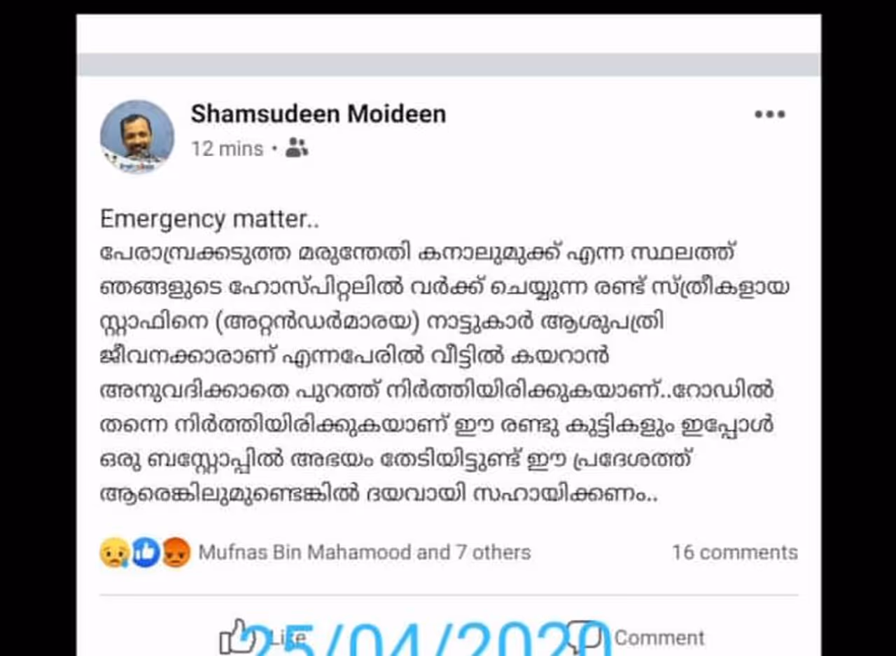 കഴിഞ്ഞ ദിവസം പേരാമ്പ്രയിലെ കനാൽ മുക്ക് എന്ന സ്ഥലത്ത് രാത്രിയോടെ സ്ത്രീകളായ രണ്ട് ആശുപത്രി ജീവനക്കാരെ വീട്ടിൽ പ്രവേശിപ്പിക്കാൻ നാട്ടുകാരനുവദിക്കാത്തിനെത്തുടർന്ന് സഹപ്രവർത്തകർ ഫേസ്ബുക്കിലിട്ട് പോസ്റ്റാണിത്. രണ്ട് മണിക്കൂറോളം ബസ്സ്റ്റോപ്പിൽ കഴിയേണ്ടി വന്ന ഇവരെ പിന്നീട് പോലീസെത്തിയാണ് വീട്ടിലേക്ക് കൊണ്ട് പോയതെന്ന് ആശുപത്രിയുടെ ചുമതലയുള്ള ഡോക്ടർ പറയുന്നു.