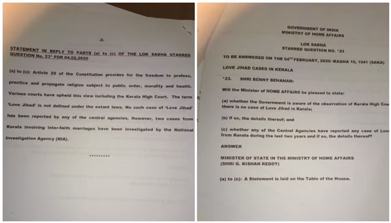 എന്നാൽ ലൗ ജിഹാദുമായി ബന്ധപ്പെട്ട ഒരു കേസും ഇതുവരെ റിപ്പോർട്ട് ചെയ്യപ്പെട്ടിട്ടില്ലെന്നാണ് കേന്ദ്ര ആഭ്യന്തര സഹമന്ത്രി ജി കിഷൻ റെഡ്ഡി, രേഖാമൂലം ബെന്നി ബെഹനാൻ എംപിക്ക് മറുപടി നൽകിയിരിക്കുന്നത്.