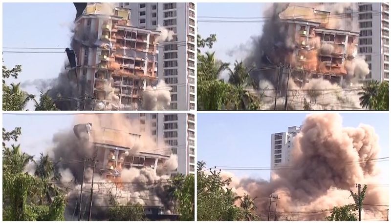 ഒന്നരക്ക് ആദ്യ സൈറൺ മുഴക്കി പ്രോട്ടോക്കോൾ അനുസരിച്ച് സുരക്ഷാ ക്രമീകരണങ്ങൾ പൂര്ത്തിയാക്കി രണ്ട് മണിക്ക് സ്ഫോടനം നടത്താനായിരുന്നു തീരുമാനിച്ചിരുന്നത്. സുരക്ഷാ ക്രമീകരണങ്ങൾ അവസാനവട്ടം ഉറപ്പിക്കുന്നതിന്റെ ഭാഗമായി 1.56 നാണ് ആദ്യ സൈറൺ മുഴങ്ങിയത്. പൊലീസും അധികൃതരും എല്ലാം ചേര്ന്ന് ആളുകളെ ഒഴിപ്പിച്ചു. നൂറ് മീറ്റര് മാറി ബ്ലാസ്റ്റ് ഷെഡിലേക്ക് വിദഗ്ധരെത്തി. കൺട്രോൾ റൂമിലും ക്രമീകരണം പൂര്ത്തിയാക്കി. ആകാംക്ഷയുടെ നിമിഷങ്ങൾക്കൊടുവിൽ ഗോൾഡൻ കായലോരം മണ്ണടിഞ്ഞു. ![]()