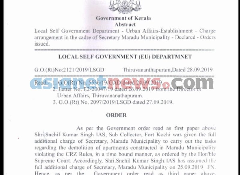 നഗരസഭയുടെ ദൈനംദിന കാര്യങ്ങളിൽ സെക്രട്ടറി ഇടപെടുന്നില്ലെന്ന് ചൂണ്ടിക്കാട്ടി തദ്ദേശ സ്വയംഭരണവകുപ്പ് മന്ത്രിക്കും ചീഫ് സെക്രട്ടറിക്കും നഗരസഭാ ചെയർപേഴ്സൺ ടി എച്ച് നദീറ പരാതി നൽകിയിരുന്നു. എന്നാൽ ഫ്ലാറ്റ് പൊളിയ്ക്കലിനുള്ള ചുമതല മാത്രമേ തനിക്കുള്ളൂ എന്ന് ചൂണ്ടിക്കാട്ടി പ്രശ്നം ചർച്ച ചെയ്യാൻ വിളിച്ച യോഗത്തിൽ നിന്ന് സെക്രട്ടറി സ്നേഹിൽ കുമാർ ഐഎഎസ് വിട്ടുനിന്നിരുന്നു. സെക്രട്ടറി ഇല്ലാതെ യോഗം ചേരുന്നതിനെച്ചൊല്ലി കൗൺസിൽ യോഗത്തിൽ ഭരണ പ്രതിപക്ഷ അംഗങ്ങൾ തമ്മിൽ വാക്കേറ്റമുണ്ടായി. തുടർന്ന് അജണ്ടകൾ എടുക്കാതെ യോഗം നിർത്തിവെച്ചു. നഗരസഭാ പ്രതിസന്ധിയുടെ ഉത്തരവാദി സർക്കാർ ആണെന്നും അടിയന്തരമായി പ്രശ്നം പരിഹരിക്കണമെന്നും ആവശ്യപ്പെട്ട് നഗരസഭ ചെയർപേഴ്സൺ സർക്കാരിന് കത്ത് നൽകുകയും ചെയ്തു. ഇതേത്തുടർന്നാണ് പ്രതിസന്ധിയിൽ സർക്കാർ ഇടപെട്ടത്.