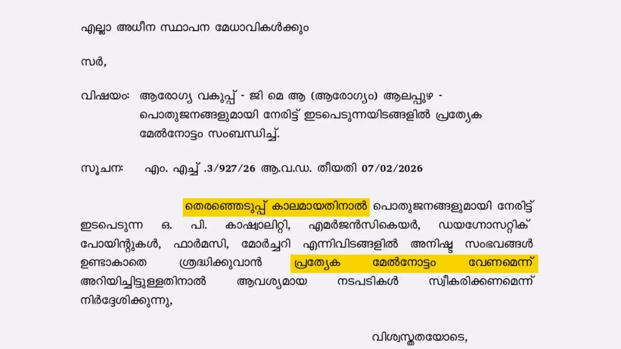 പൊതുജനാരോഗ്യ മേഖലയിൽ തുടർച്ചയായുണ്ടാകുന്ന വീഴ്ചകൾ തെരഞ്ഞെടുപ്പ് പശ്ചാത്തലത്തിൽ സർക്കാരിനെ പ്രതിസന്ധിയിലാക്കുന്നു. സർക്കാരിനെതിരെ പ്രചാരണം നടത്തുമ്പോൾ, തെരഞ്ഞെടുപ്പ് കാലത്ത് പ്രത്യേക ശ്രദ്ധ വേണമെന്നാവശ്യപ്പെട്ട് ആലപ്പുഴ ഡിഎംഒ സർക്കുലർ ഇറക്കി.